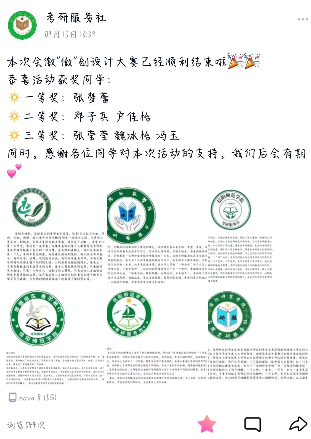 为了让更多的同学了解考研服务社的服务宗旨以及社团理念,传承考研服务精神,扩大考研服务社的影响力。4月9日至4月14日,考研服务社在线上开展会徽“微”设计大赛。