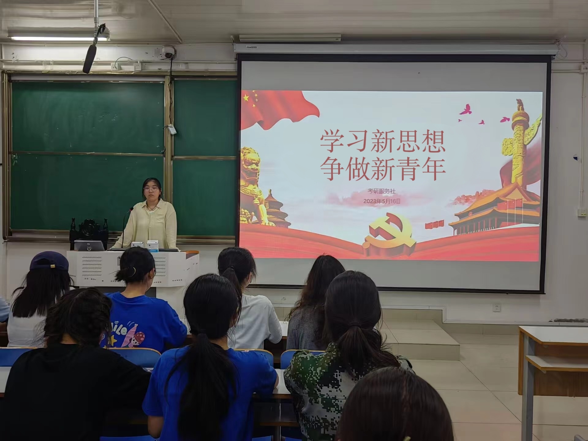 为深入学习贯彻习近平新时代中国特色社会主义思想,增强学生思想政治觉悟,鼓励学生砥砺前行,5月16日晚,考研服务社在社科楼514开展了“学习新思想,争做新青年”主题团课活动。本次团课由邵伟娜主持,考研服务社全体成员参加。