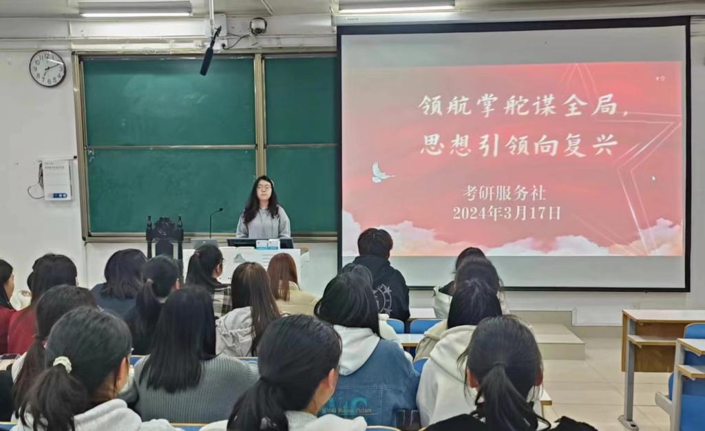 为深入学习贯彻习近平新时代中国特色社会主义思想,坚持全面深化改革,坚持新发展理念,坚持人与自然和谐共生等重大原则,3月17日晚,考研服务社在社科楼514开展了“领航掌舵谋全局,思想引领向复兴”主题团课。社团全体成员参加本次团课活动,团课由团支书冯钰丹主持。