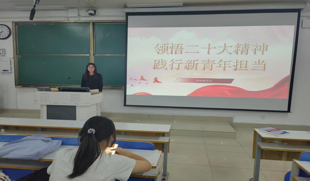 为深入贯彻党的二十大精神,引领社团成员成为有理想、敢担当、能吃苦、肯奋斗的新时代青年。4月18日,考研服务社于社科楼515成功举办“领悟二十大精神,践行新青年担当”主题团课活动,全体社团成员参于其中,活动由社长丁文倩与团支书冀艺婷共同主持。