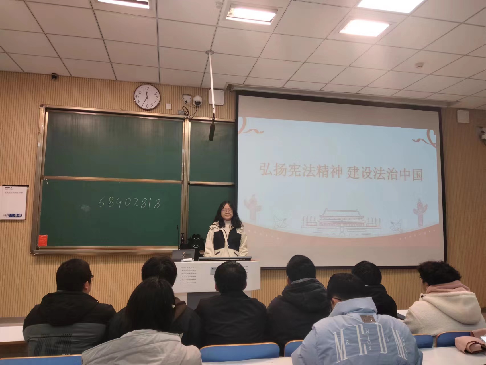本次活动由团支书许梦柯主持。首先,许梦柯对本次团课的活动主题进行简单介绍,带领社团成员了解宪法的基本知识,初步认识依法治国的内涵,为接下来学习宪法的核心内容做了铺垫。然后,许梦柯将二十大对新时代新征程党和国家事业发展作出的部署进行了详细的PPT展示,突出宪法固根本、稳预期、立长远的保障作用,加深了社团成员对宪法的理解和认识。随后,许梦柯邀请部分同学讲述对宪法的见解,社团成员踊跃发言,结合自己的日常生活,表达了自己的深刻看法。最后,许梦柯采用了随机提问的测试方法,加深了社团成员对宪法知识的印象。