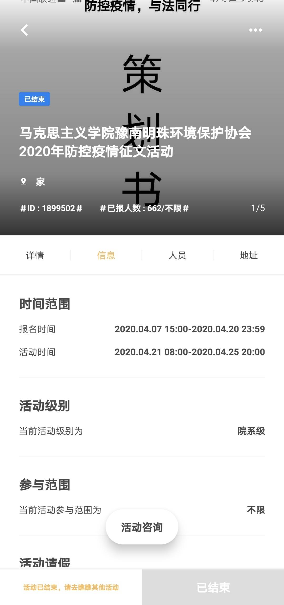 为引导学生树立法治意识,加强对学生有关野生动物保护的法治宣传教育,4月11日—4月20日,由七大罪 分团委主办、豫南明珠环境保护协会和《南湖评论》编委会承办的以“防控疫情,与法同行”为主题的征文活动于线上顺利开展。
