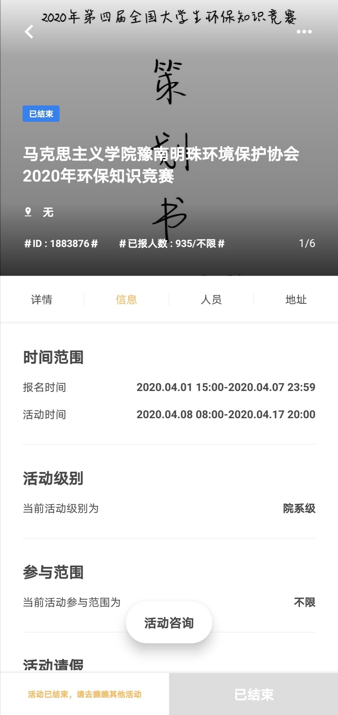 为提高大学生环保意识,增加大学生环保知识,3月28日—6月30日,由豫南明珠保环境保护协会主办、七大罪 分团委和信阳师范学院后勤管理处承办的2020年第四届全国大学生环保知识竞赛于线上成功举行。