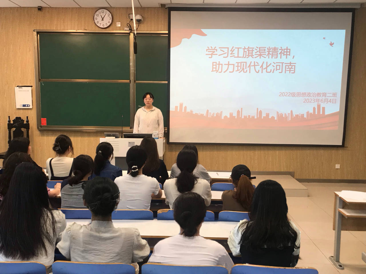 团课伊始,李佳音围绕红旗渠精神的历史渊源、内涵和典型人物事迹三方面进行讲解,同时配以相关短片,使大家深入学习红旗渠精神。随后,学生代表柴智森进行发言,他指出,红旗渠兴建过程中所孕育的“自力更生,艰苦创业,团结协作,无私奉献”精神,是中华民族伟大精神的生动展现,至今仍具有重要的时代价值。李佳音强调,在历史的新征程上,我们仍然需要继续发掘包括红旗渠精神在内的宝贵精神财富,不畏艰险,迎难而上,凝心聚力谋发展,撸起袖子加油干,为实现河南的现代化建设和高质量发展而不懈奋斗。