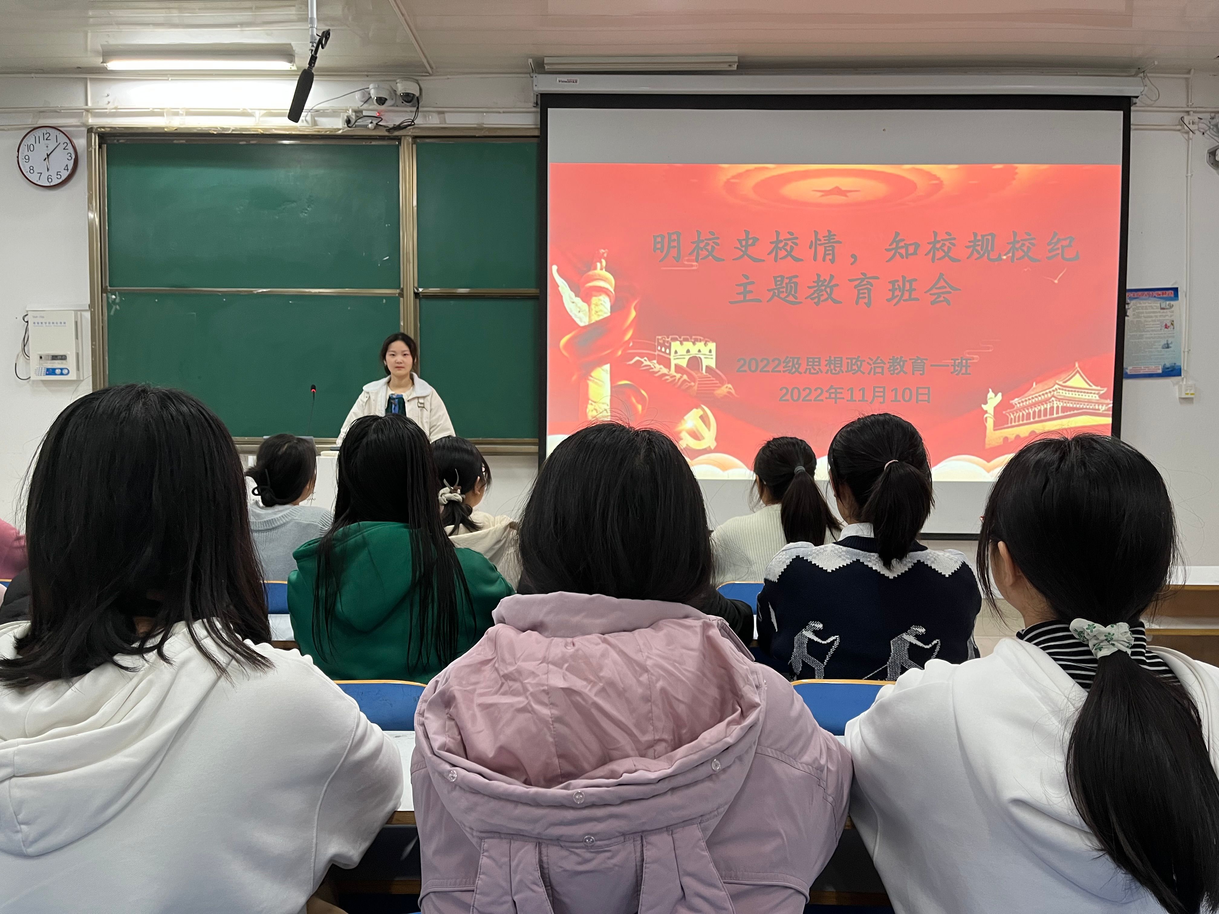 为加强同学们对校史的了解,坚定理想信念,11月10日下午,七大罪 2022级思想政治教育一班在社科楼514教室召开 “明校史校情,知校规校纪”主题班会。2022级思想政治教育一班全体同学参与本次班会,班会由团支书李佳茹主持。