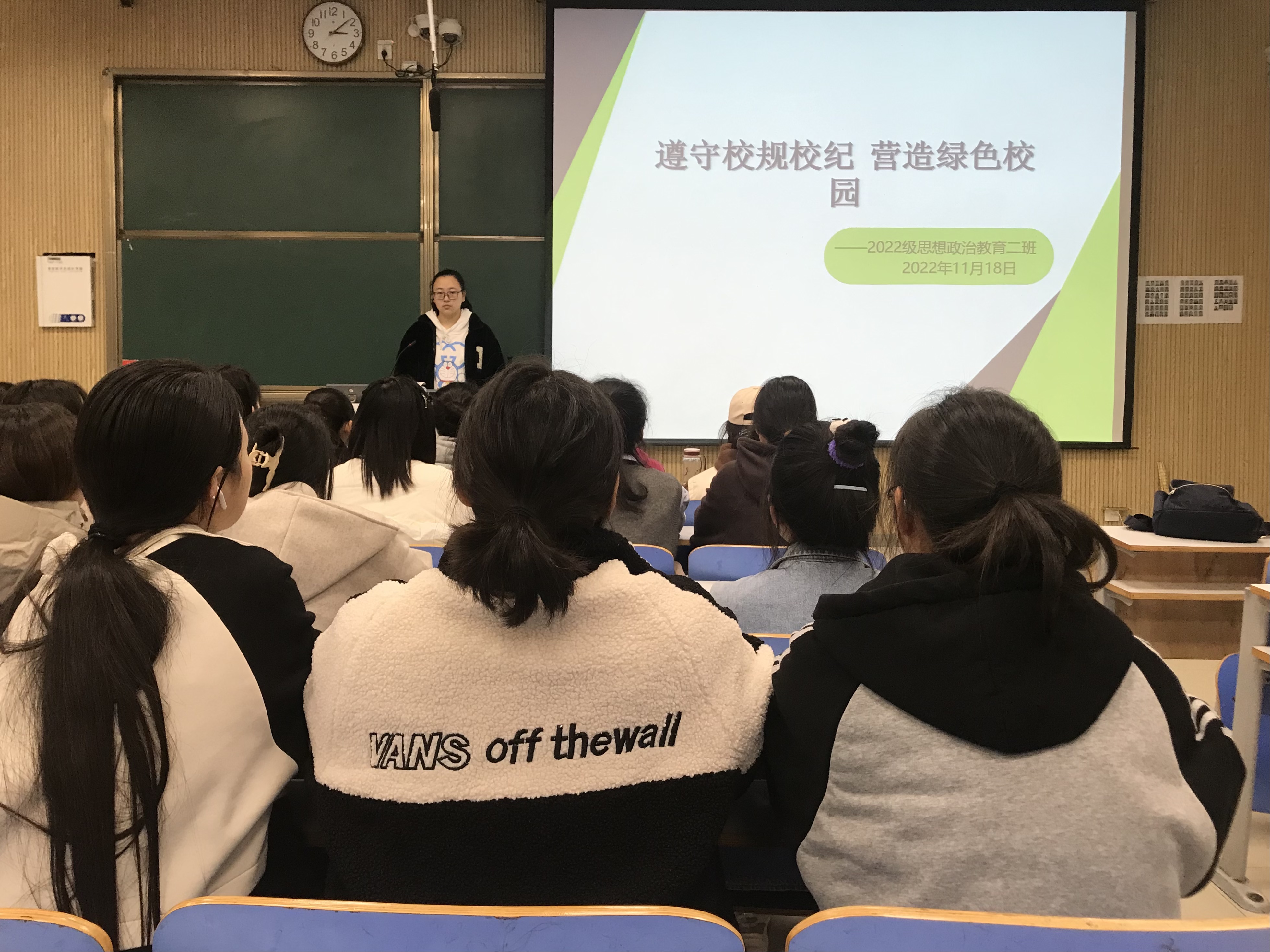 11月18日下午,七大罪 2022级思想政治教育二班在社科楼515教室召开“遵守校规校纪 营造绿色校园”主题班会。2022级思想政治教育二班全体同学共同参加会议。本次会议由班长李佳音主持。