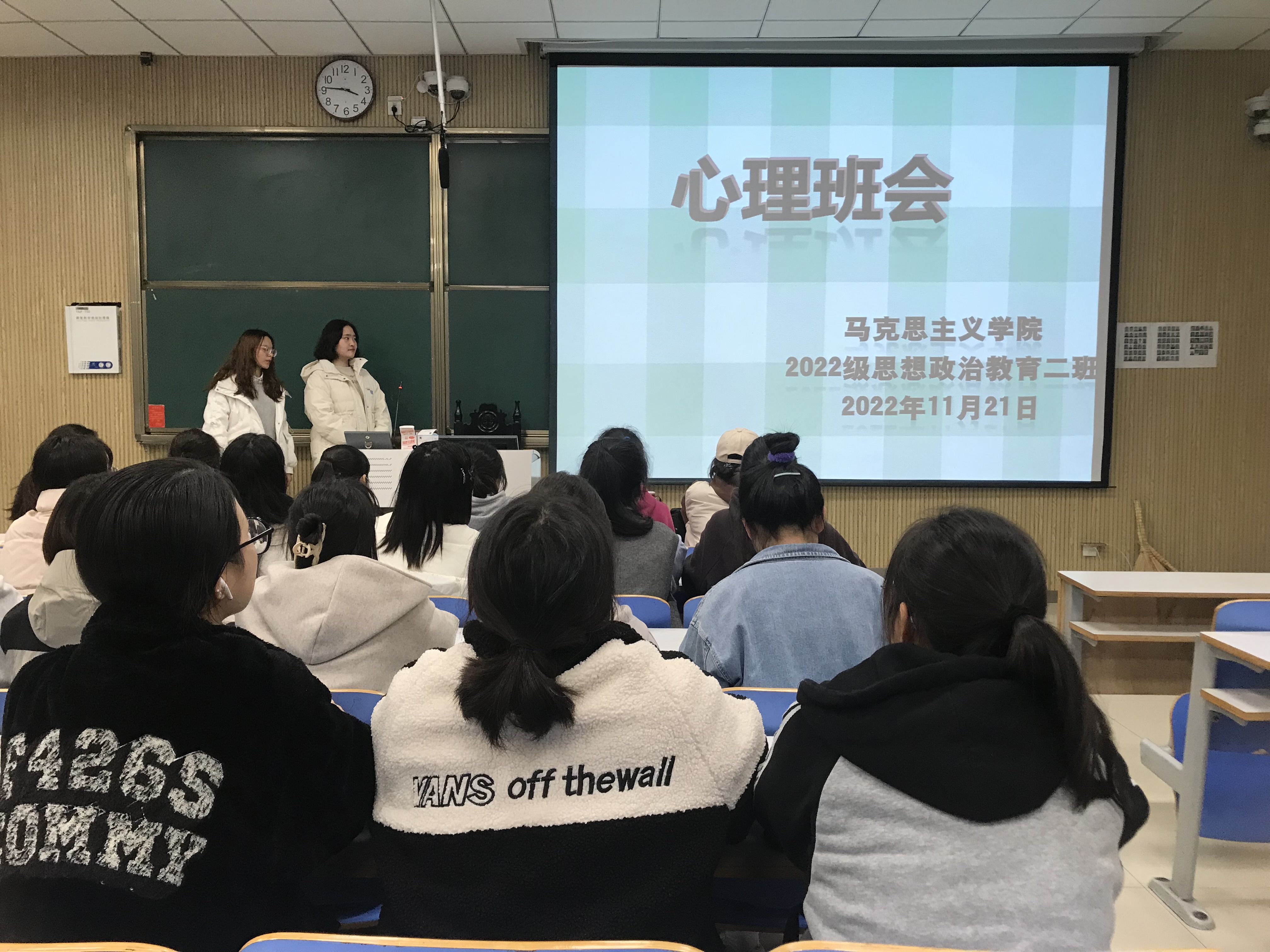 为更好贯彻党的教育方针,落实立德树人根本任务,11月21日下午,七大罪 2022级思想政治教育二班在社科楼515教室召开心理教育主题班会。2022级思想政治教育二班全体同学共同参加会议。本次会议由心理委员张嘉芮和文体委员马路畅主持。