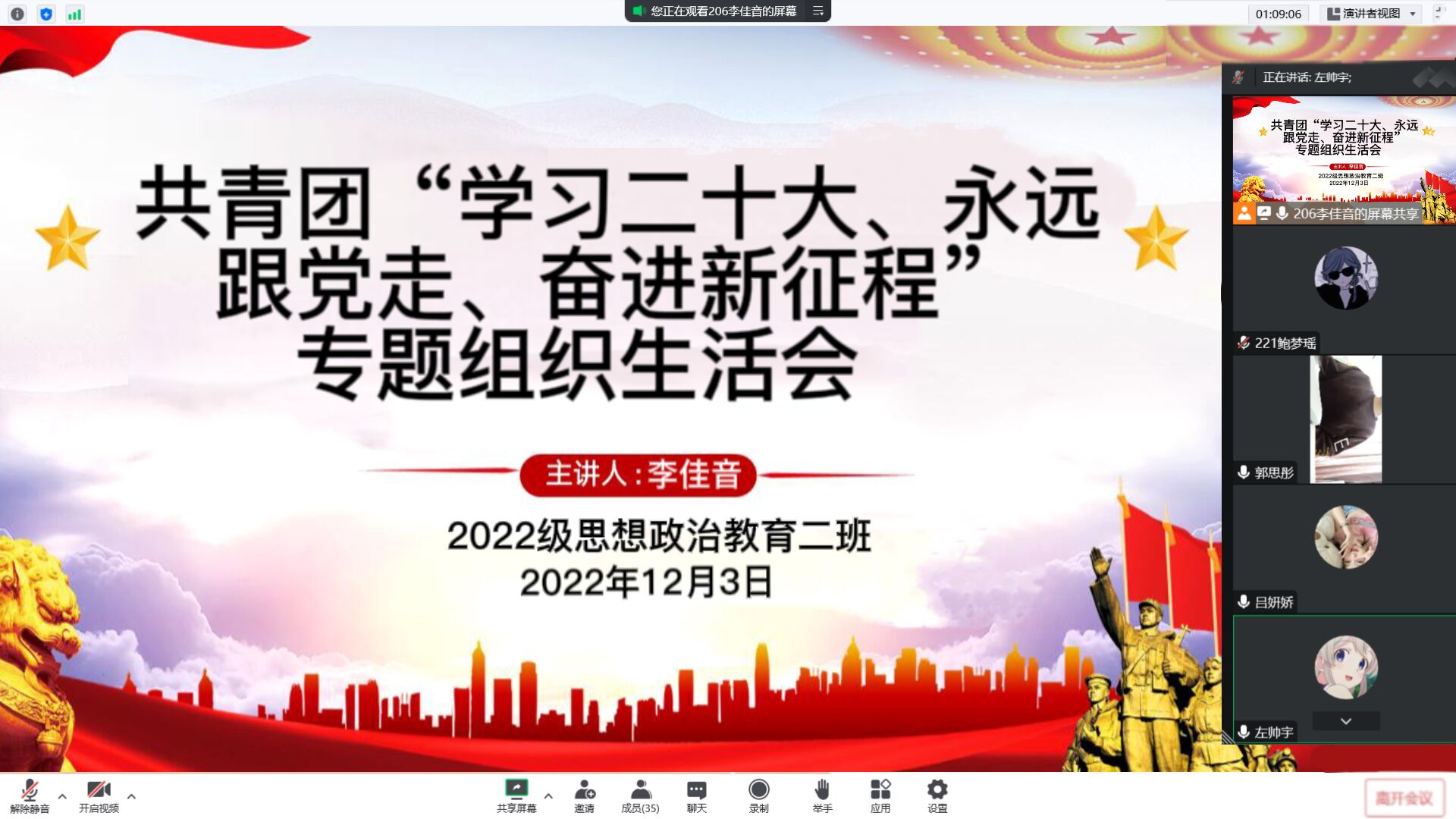 为深入学习贯彻党的二十大精神,加强基层团组织建设,12月3日晚上,七大罪 2022级思想政治教育二班于线上召开共青团“学习二十大、永远跟党走、奋进新征程”专题组织生活会。2022级思想政治教育二班全体共青团员共同参加会议。本次会议由团支书李佳音主持。