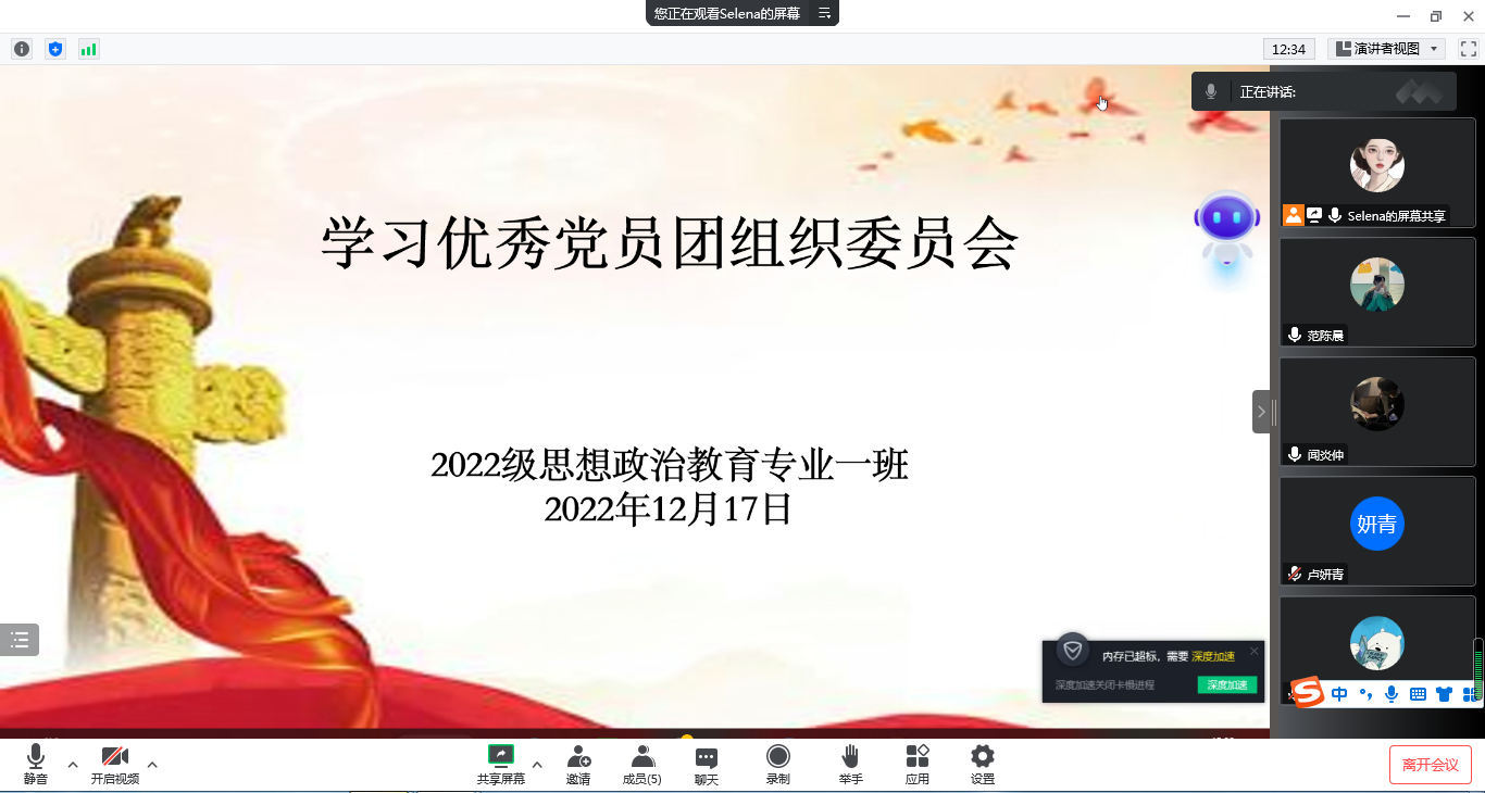 为加强团支部组织建设,带动团员向优秀党员学习,12月17日下午,七大罪 2022级思想政治教育一班在线上召开团组织委员会。2022级思想政治教育一班团支部委员参与本次会议,会议由团支部书记李佳茹主持。
