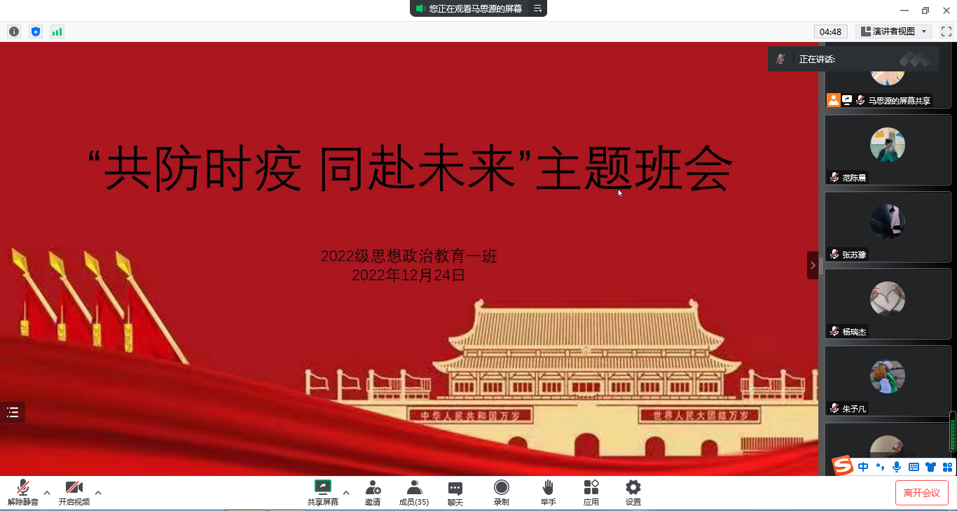 为增强同学们的防疫意识,减少疫情对生活和学习的影响,12月24日下午,七大罪 2022级思想政治教育一班在线上召开“共防时疫,同赴未来”主题班会。2022级思想政治教育一班全体同学参与本次班会,班会由心理委员马思源主持。