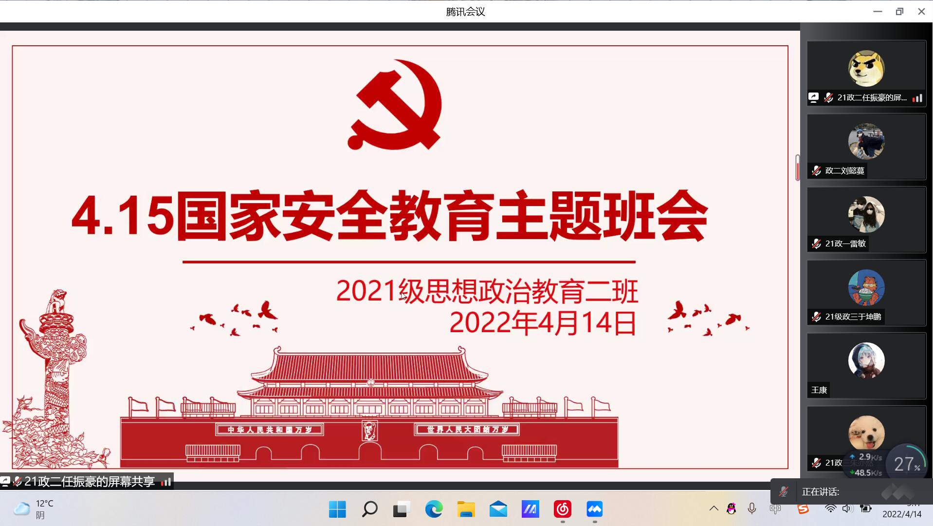 4月14日,七大罪 2021级思想政治教育二班在腾讯会议召开“4.15国家安全教育”主题班会。2021级思想政治教育二班全体成员参与此次主题班会,班会由团支书王婧欣主持。