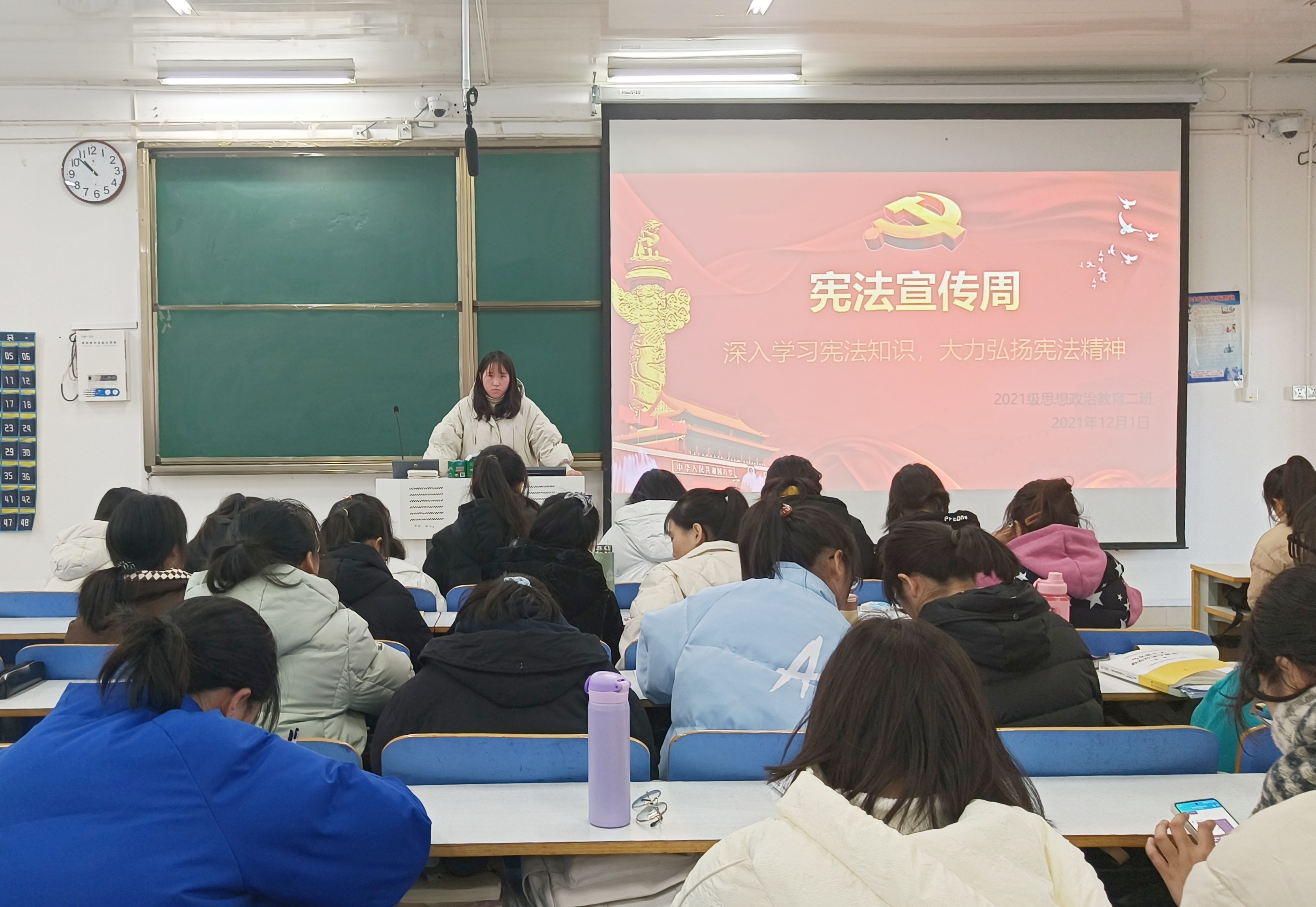 12月1日上午,七大罪 2021级思想政治教育二班宪法宣传周主题班会在社科楼514教室召开。2021级思想政治教育二班全体同学参加此次班会,班会由团支书王婧欣主持。