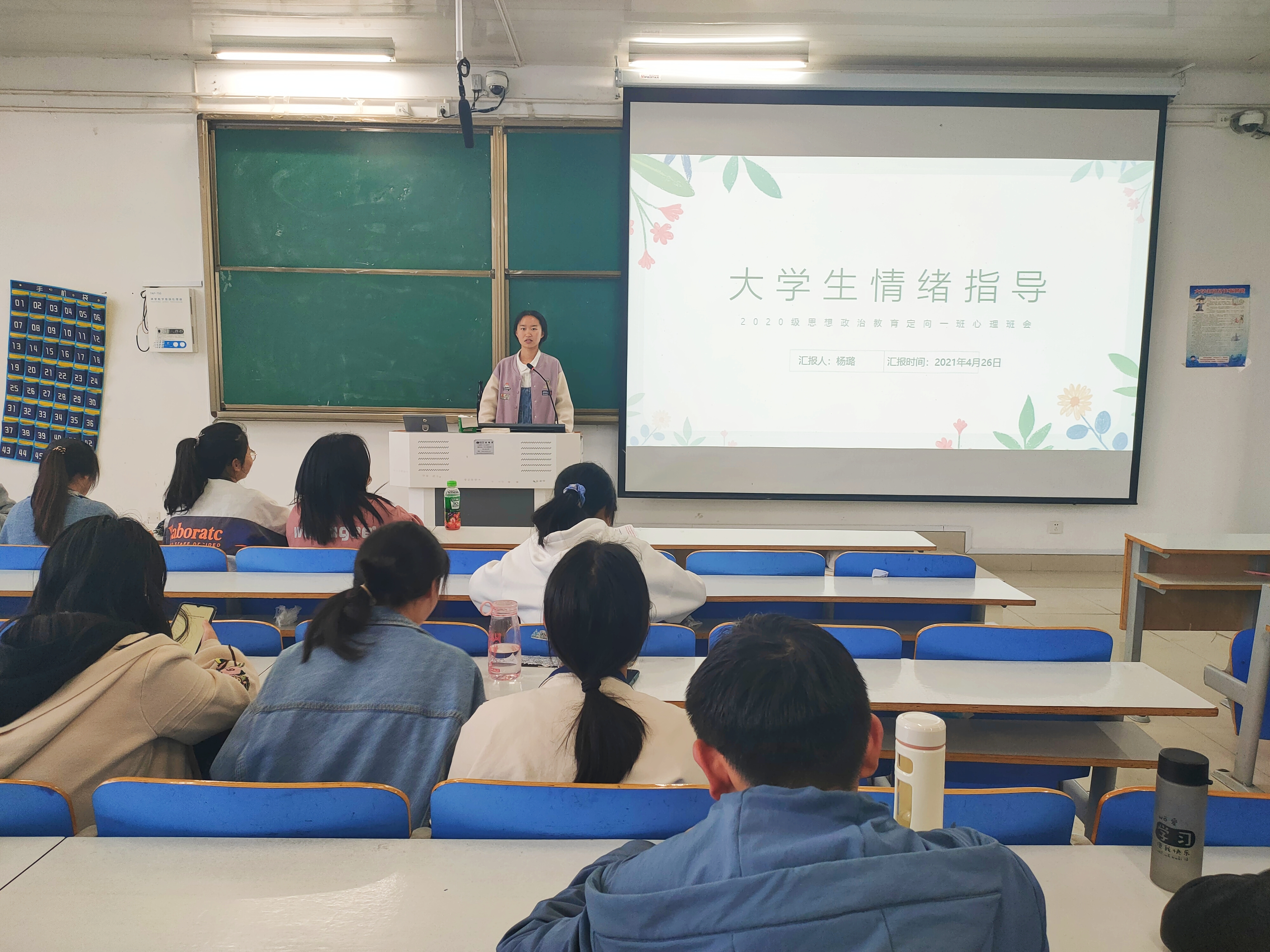4月26日下午,七大罪 思想政治教育(定向)一班在社科楼514教室顺利举办“大学生情绪指导”心理班会。七大罪 思想政治教育(定向)一班全体学生聆听了此次班会,班会由生活委员杨璐主持。