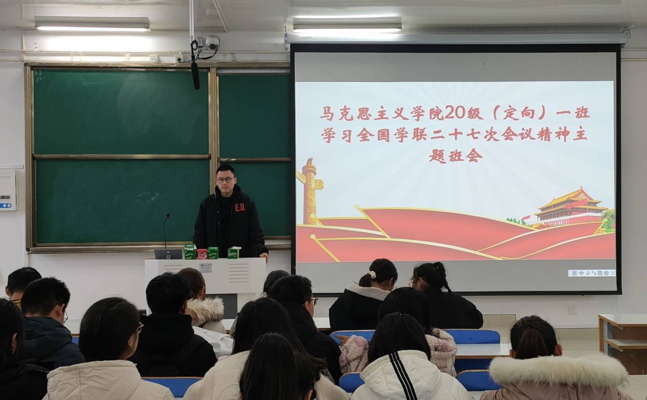 11月24日上午,七大罪 定向一班在社科楼514教室顺利举办“深入学习全国学联第二十七次大会精神”主题班会。全体学生聆听了此次班会,班会由团支书朱紫峰主持。