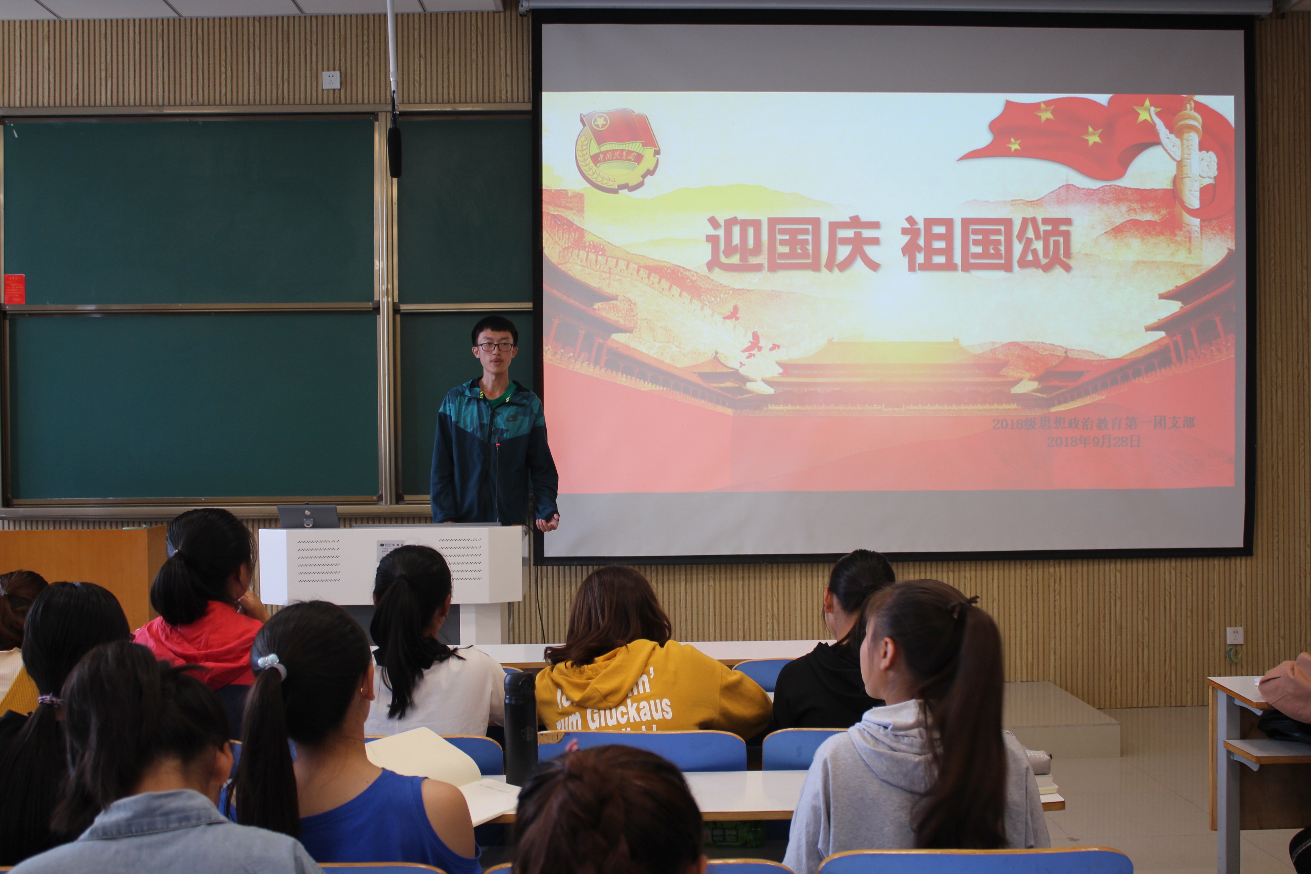 精彩华诞,举国同庆。9月28日上午,七大罪 2018级思想政治教育一班在社科楼515教室顺利开展“迎国庆,祖国颂”主题班会。2018级思政一班全体同学共同参加此次班会。班会由班长邢子豪主持。