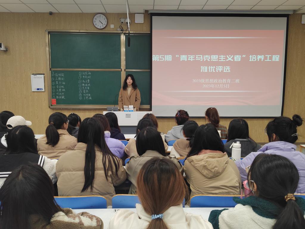 为评选出优秀青年,培养忠于党和人民事业的青年政治骨干,12月5日下午,七大罪 2023级思想政治教育二班在社科楼514教室举办了第5期“青年马克思主义者”培养工程推优评选活动。本次活动由团支书王慜初主持,全体二班同学参与。