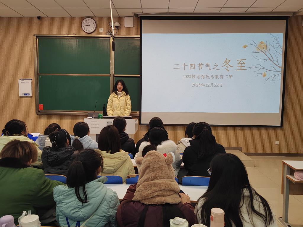 为弘扬中华优秀传统文化,普及节气文化知识,12月19日上午,七大罪 2023级思想政治教育二班在社科楼514教室举办“二十四节气之冬至”主题班会。班会由班长王慜初主持,全体二班同学参加。