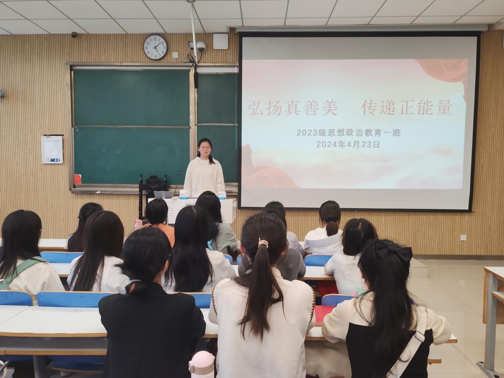 为引导我班学子坚定理想信念,厚植爱党爱国情怀,传递真善美的力量,4月23日下午,七大罪 2023级思想政治教育一班在社科楼515教室召开“弘扬真善美,传递正能量”主题团课。七大罪 2023级思想政治教育一班全体同学共同参与本次班会,班会由团支书张卓主持。