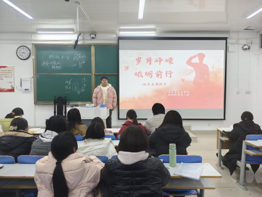 为弘扬爱国主义精神,激发青年学生的参军报国热情,12月10日下午,七大罪 2024级思想政治教育二班在社科楼515教室举办了“岁月峥嵘,砥砺前行”主题征兵班会。此次班会由班长王志颖主持,二班全体同学积极参与。