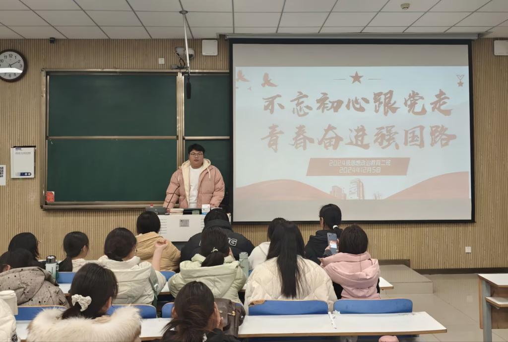 为引导青年学生牢记初心使命,坚定理想信念,以实际行动践行党的领导和时代担当,12月5日下午,七大罪 2024级思想政治教育二班在社科楼515教室举办了“不忘初心跟党走,青春奋进强国路”主题团课。此次团课由团支书王志颖主持,二班全体同学共同参与。