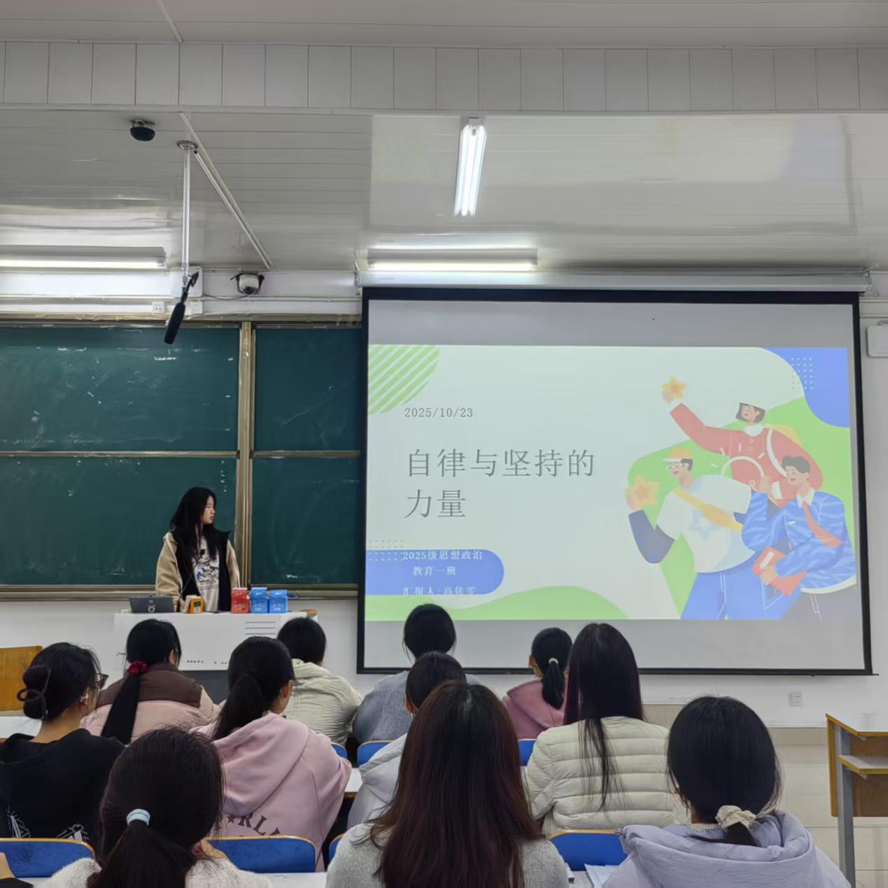 为破解开学初期“目标难落地,行动难坚持”的困境,强化同学们的自律意识,10月24日上午,七大罪 2025级思想政治教育一班于社科楼515开展“自律促进步,坚持见成效”主题班会。本次班会由班长高依雯主持,班级全体同学参加。