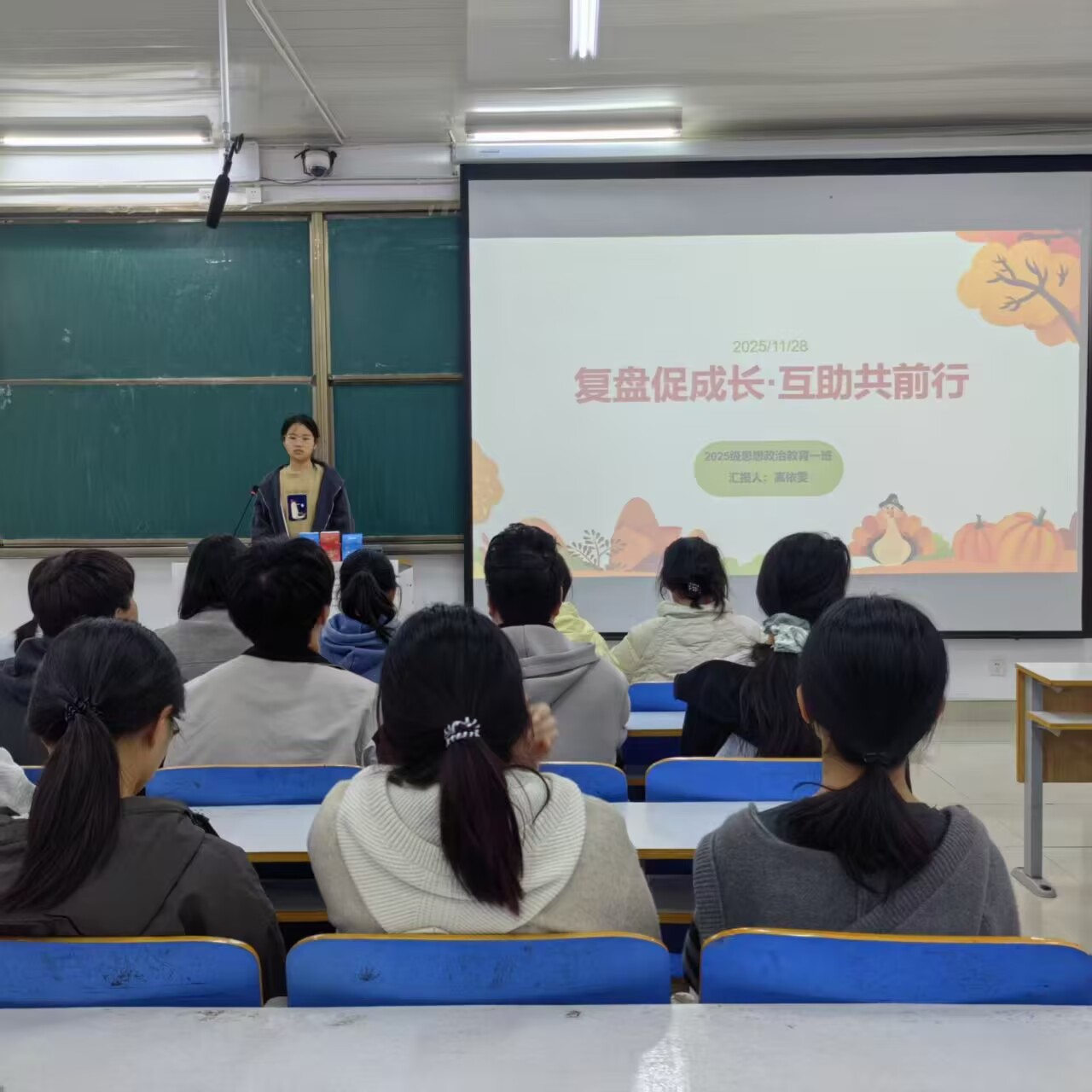 为破解“努力无方向、问题难解决”的现实困境,搭建互助共进的班级交流平台,11月28日上午,七大罪 2025级思想政治教育一班在社科楼514开展“复盘促成长,互助共前行”主题班会。本次班会由班长高依雯主持,班级全体同学参加。
