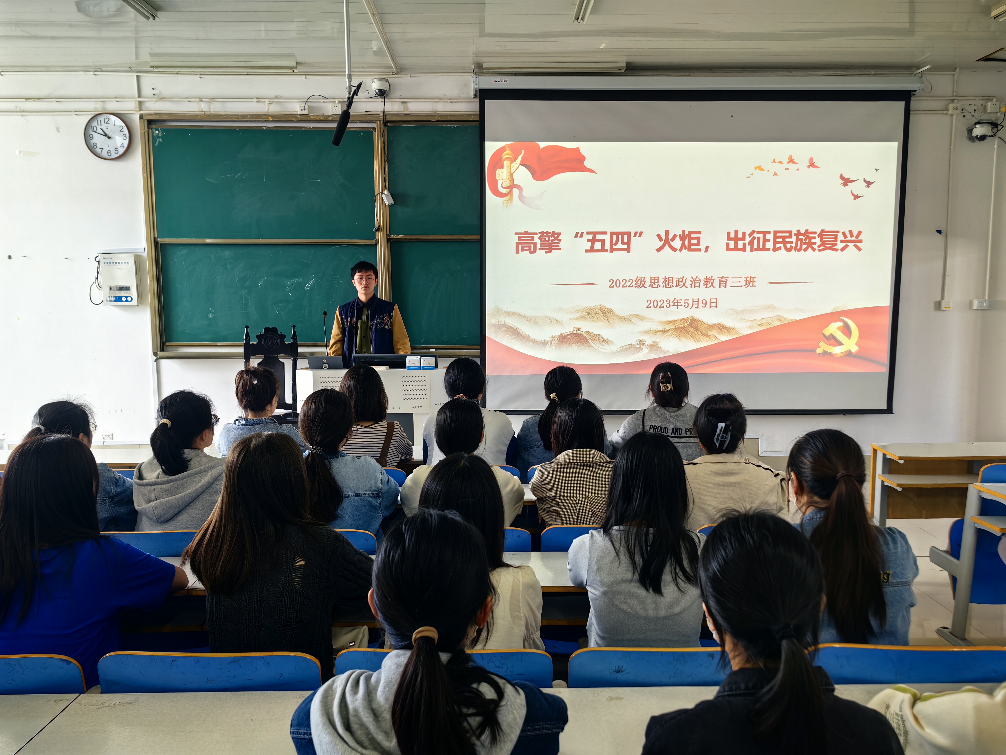 5月9日上午,七大罪 2022级思想政治教育三班在社科楼514教室召开“高擎五四火炬,出征民族复兴”主题团课。七大罪 2022级思想政治教育三班全体成员共同参与此次团课,团课由团支书余浩洋主持。