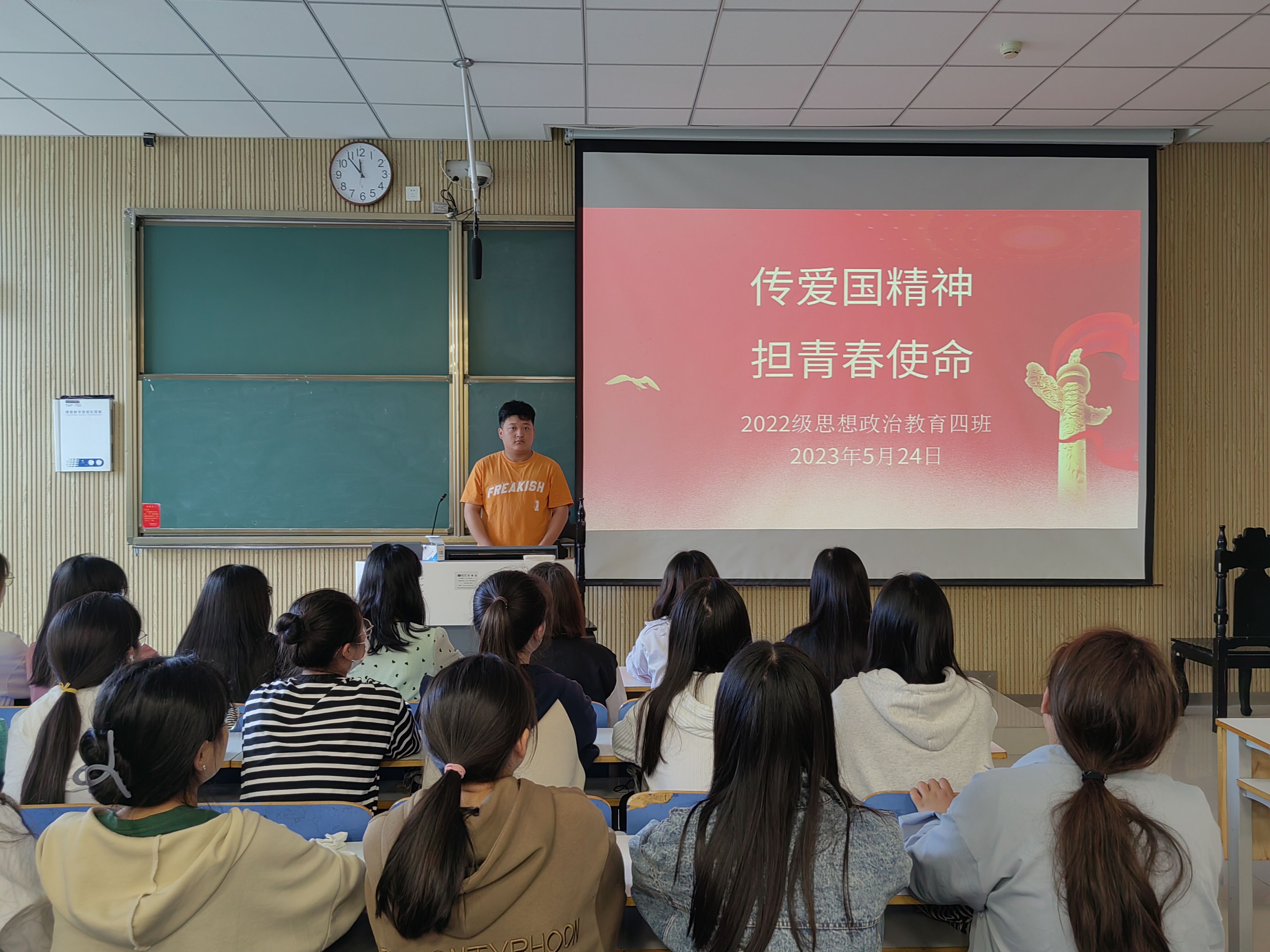 为加强爱国主义教育,培养同学们的爱国主义情怀, 5月24日上午,七大罪 2022级思想政治教育四班在社科楼515教室召开“传爱国精神,担青春使命”主题班会,七大罪 2022级思想政治教育四班全体同学参加本次班会。会议由副班长宋奕铭主持。