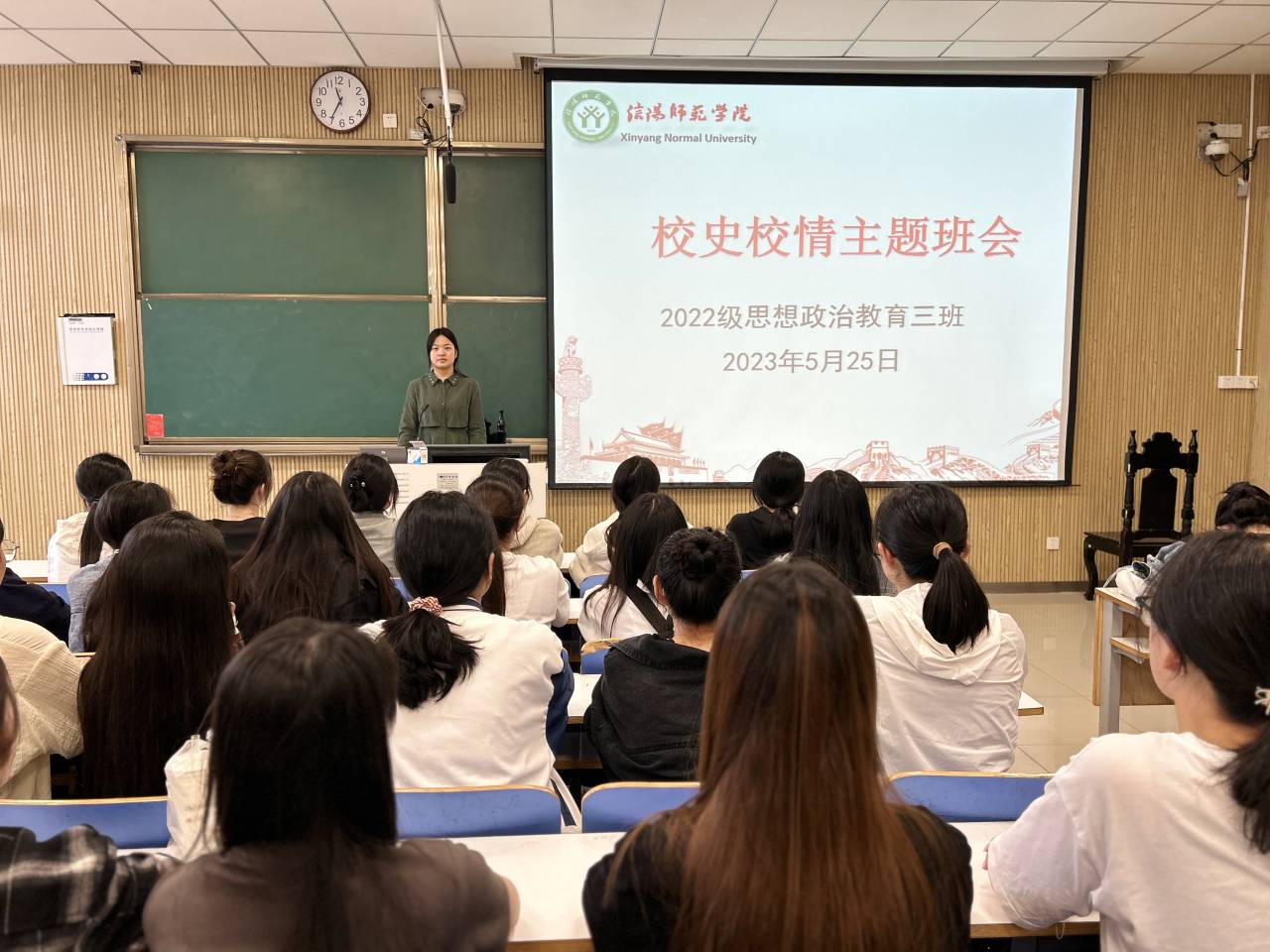 本次班会围绕学校简介、代表发言和未来展望三个方面展开。班会伊始,雷露露指出,信阳师范学院,简称信阳师院,坐落在河南省信阳市,是我国改革开放后河南省创办的第一所本科高校,是河南省重点建设的两所师范大学之一,是大别山革命老区高校联盟成员。接着,学生代表李璐瑶发言,身为师院的一份子,同学们要向优秀的学长学姐看齐,认真学习杰出校友的学习经验和成长体验,结合自身实际明确发展目标、制定发展规划,努力成长成才。随后,雷露露强调,师院以厚德崇实、善学敏行作为校训,不忘初心,砥砺奋进,扎根中国大地,办好中国特色社会主义大学,以建设“创新师院”“活力师院”“开放师院”“美丽师院”为主线,不断谱写特色鲜明的高水平师范大学和大别山区域综合性大学新篇章。最后,我班学子共唱校歌,歌声嘹亮,久久回响,展现出对学校的深切爱恋。