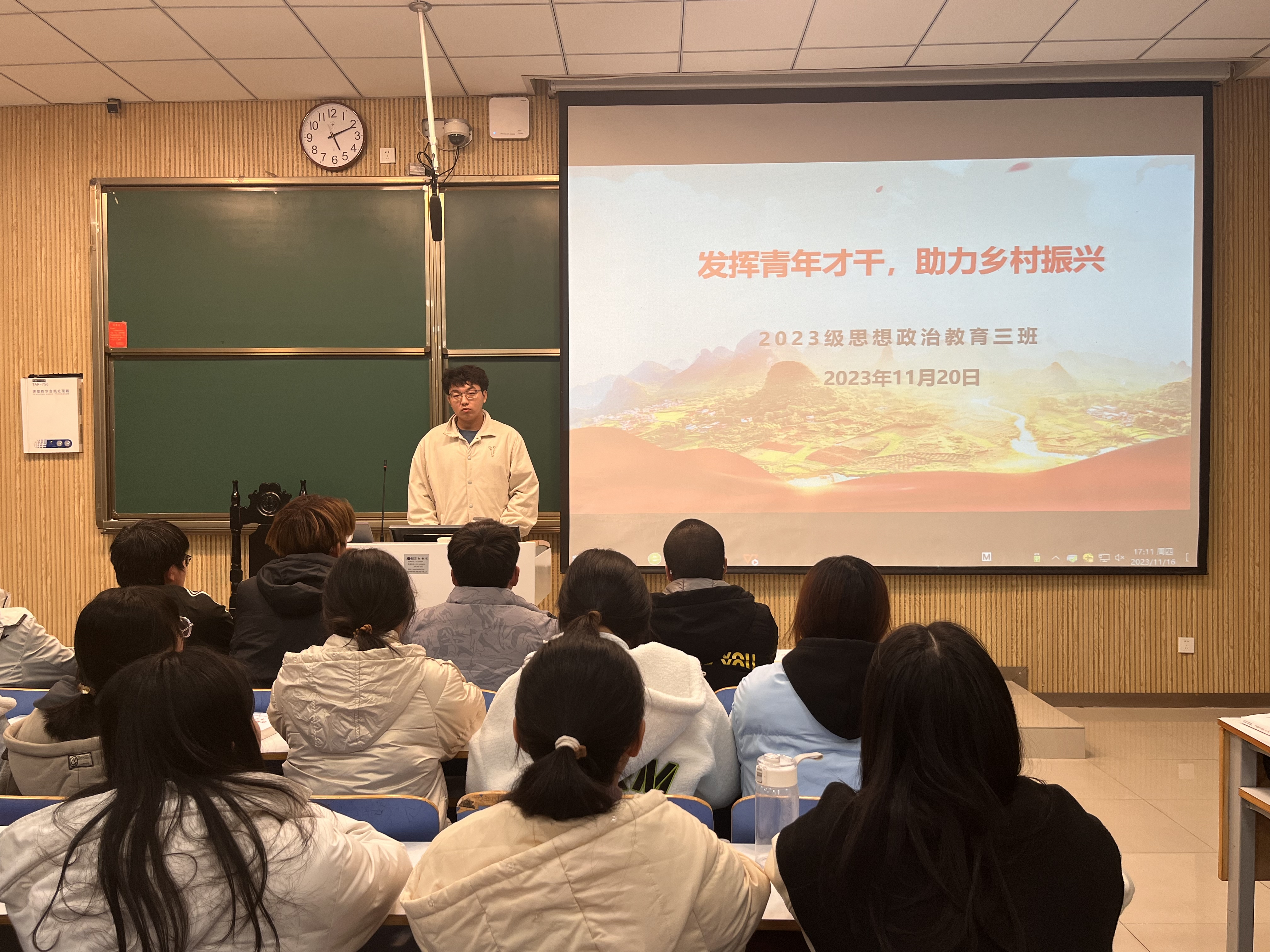 为推动建设美丽中国,发挥青年才干,11月20日上午,七大罪 2023级思想政治教育三班在社科楼515教室召开“发挥青年才干,助力乡村振兴”主题团课。七大罪 2023级思想政治教育三班全体成员共同参加此次团课,团课由团支书郝瀚主持。