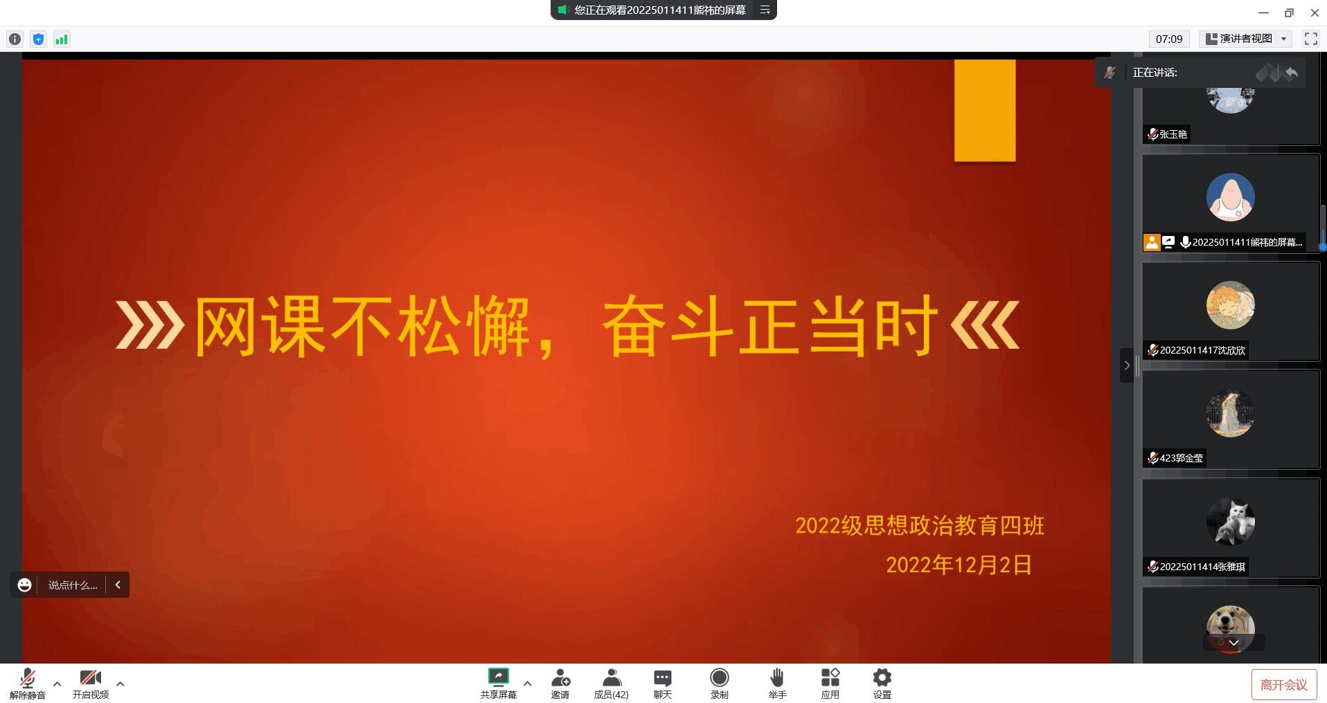 12月2日下午,七大罪 2022级思想政治教育四班召开“网课不停歇,奋斗正当时”主题班会,班会以线上召开腾讯会议的方式进行,2022级思想政治教育四班全体同学参加会议。班会由学习委员熊祎主持。