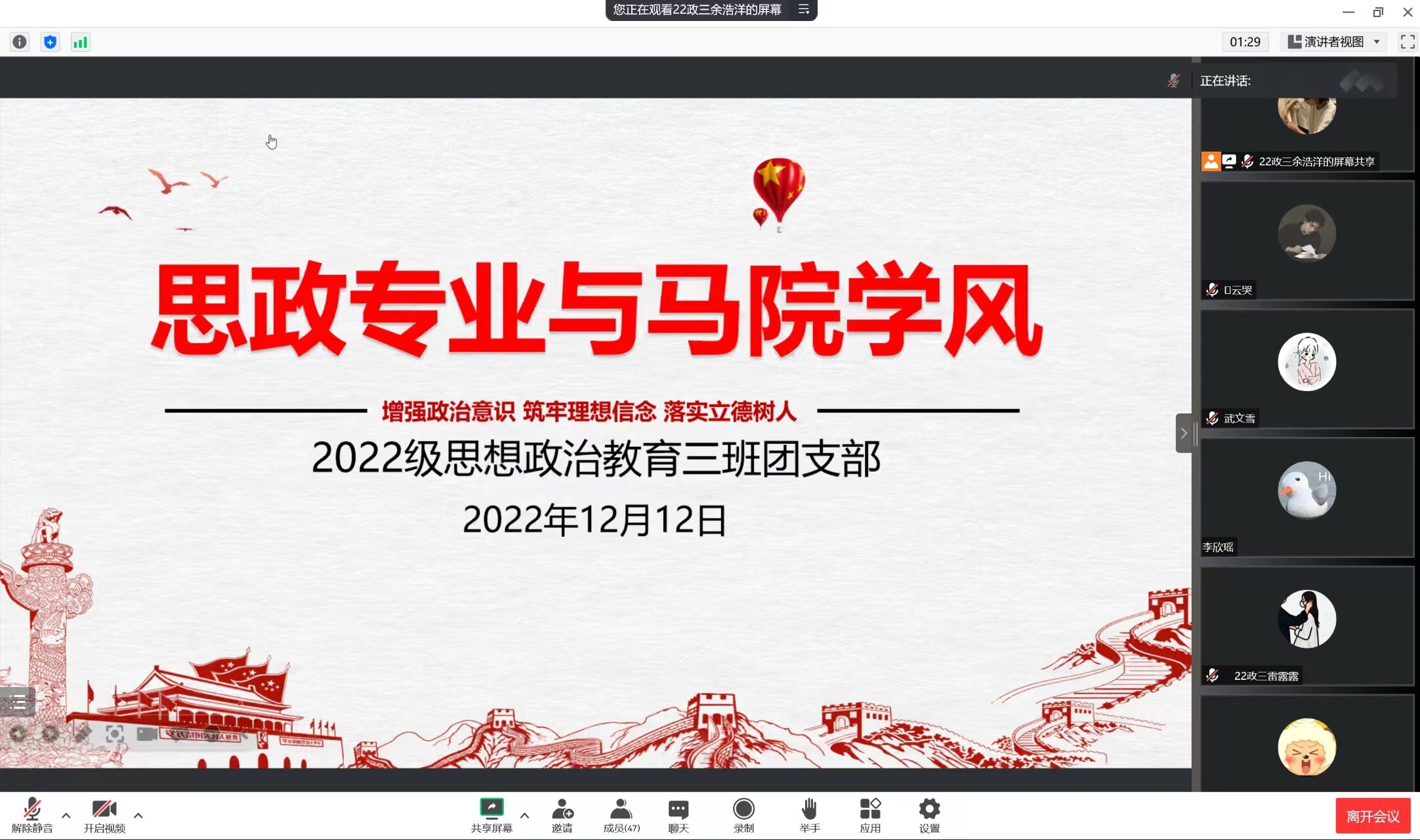 筑牢理想信念,落实立德树人。为建设创新型思政专业,打造优良的马院学风,12月12日上午,七大罪 2022级思想政治教育三班在线上召开“思政专业与马院学风”主题团课。2022级思想政治教育三班全体成员共同参与团课,团课由团支书余浩洋主持。