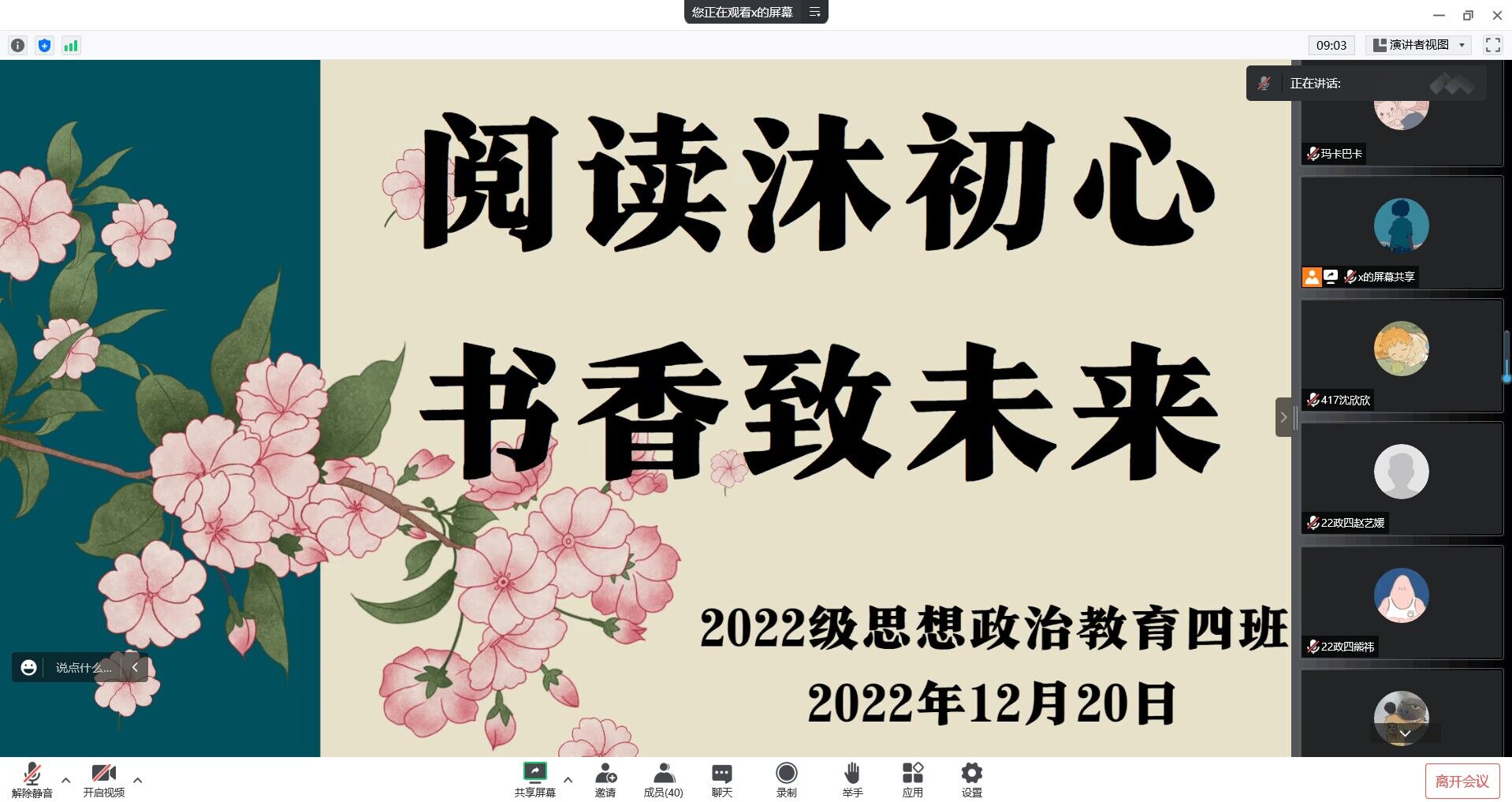 为提高同学们阅读积极性,营造浓厚书香氛围,12月20日下午,七大罪 2022级思想政治教育四班线上召开“阅读沐初心,书香致未来”主题班会,2022级思想政治教育四班全体同学参与本次班会。会议由学习委员熊祎主持。