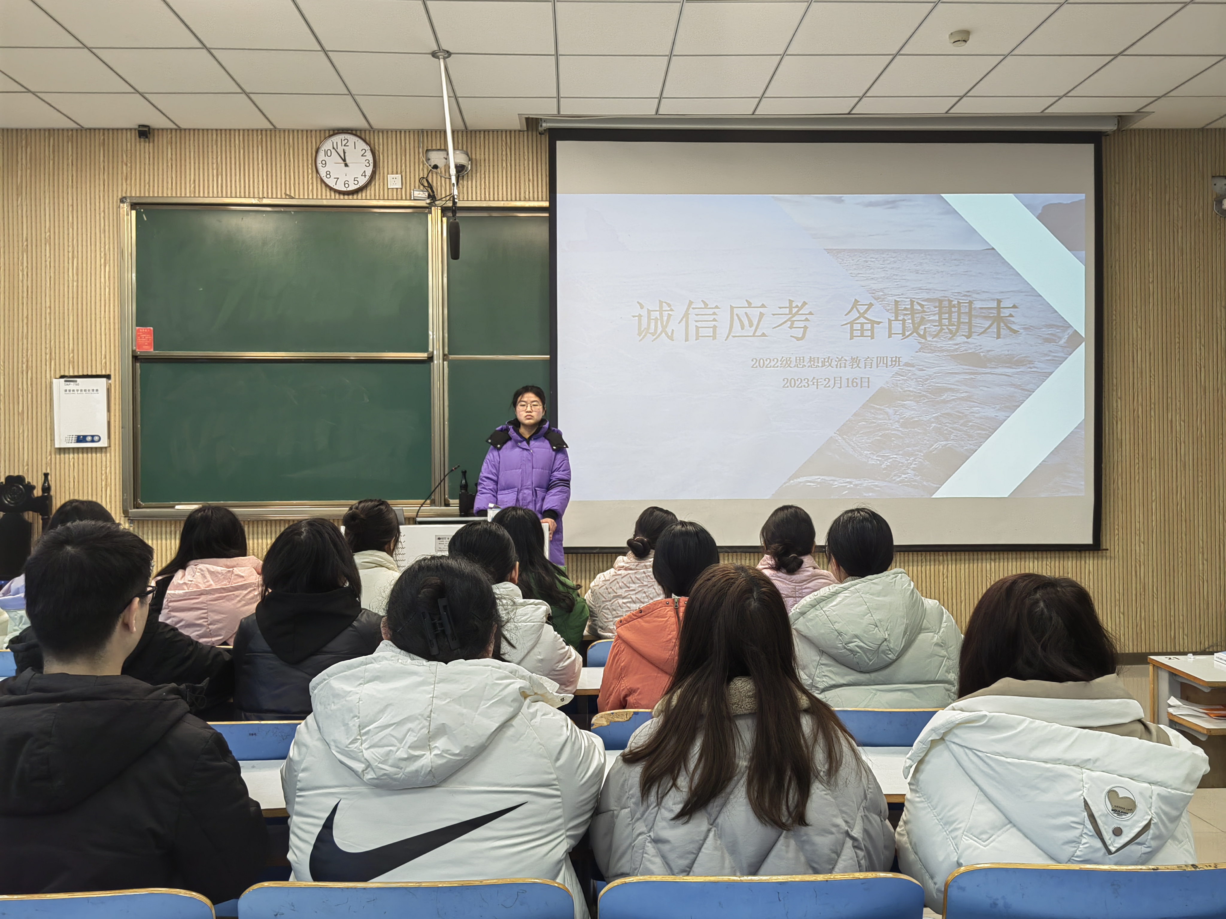 为加强学院学风建设和诚信教育,营造公平、公正的考试氛围,2月16日下午,七大罪 2022级思想政治教育四班在社科楼515教室召开“诚信应考,备战期末”主题班会,2022级思想政治教育四班全体同学参加本次班会。会议由学习委员熊祎主持。