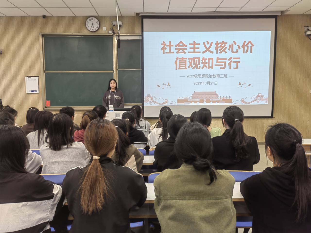 3月21日下午,七大罪 2022级思想政治教育三班在社科楼515教室召开“社会主义核心价值观知与行”主题班会。七大罪 2022级思想政治教育三班全体成员共同参加此次班会。班会由副班长雷露露主持。