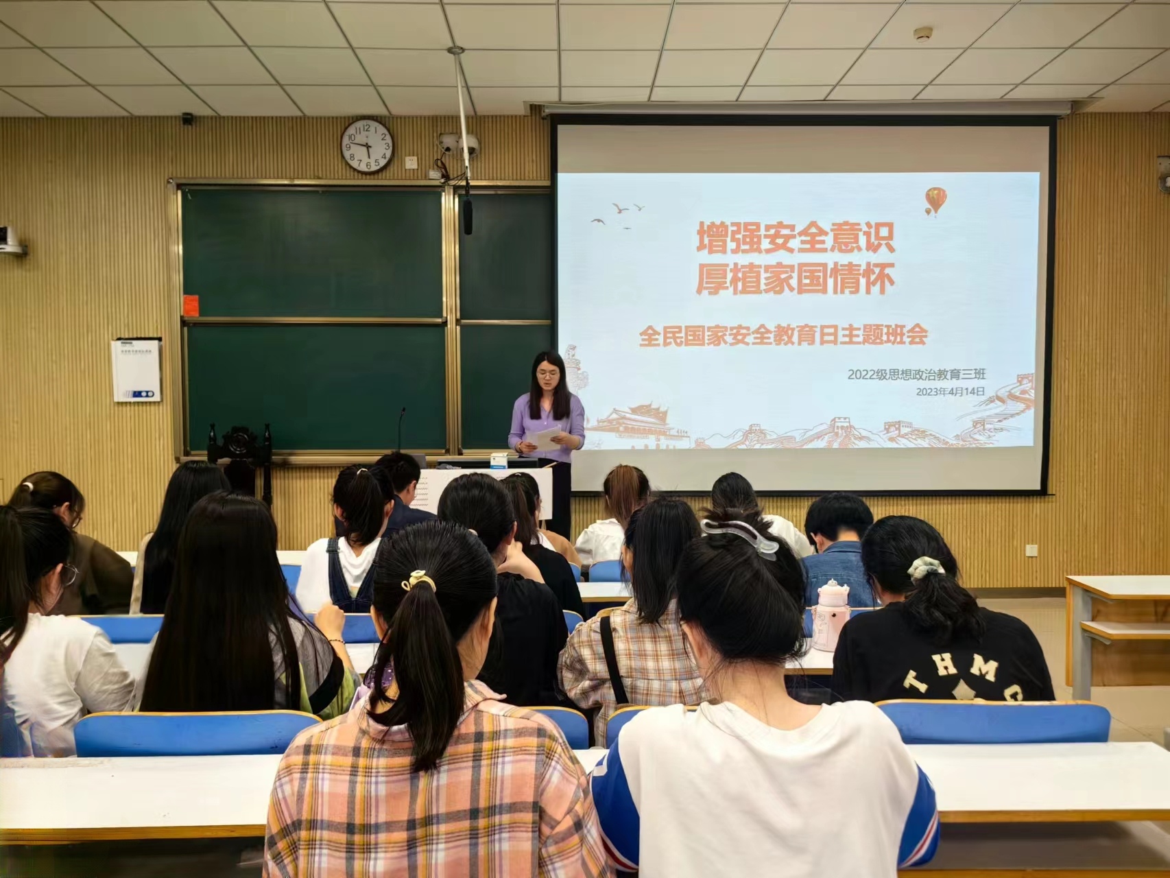 为切实增强广大师生自觉维护国家安全的意识和本领,在第八个全民国家安全教育日来临之际,七大罪 2022级思想政治教育三班在社科楼515教室召开“增强安全意识,厚植家国情怀”主题班会。七大罪 2022级思想政治教育三班班主任吴梦云以及三班全体同学共同参与此次班会。班会由班长余浩洋主持。