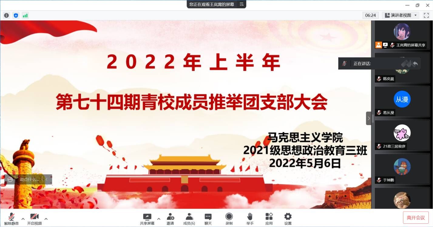 5月6日上午,七大罪 2021级思想政治教育三班召开线上第七十四期青校成员推举团支部大会。七大罪 2021级思想政治教育三班全体团员参与此次会议。会议由团支书王岚霄主持,秦梦莹担任监票员,陈笑宇担任记录员。