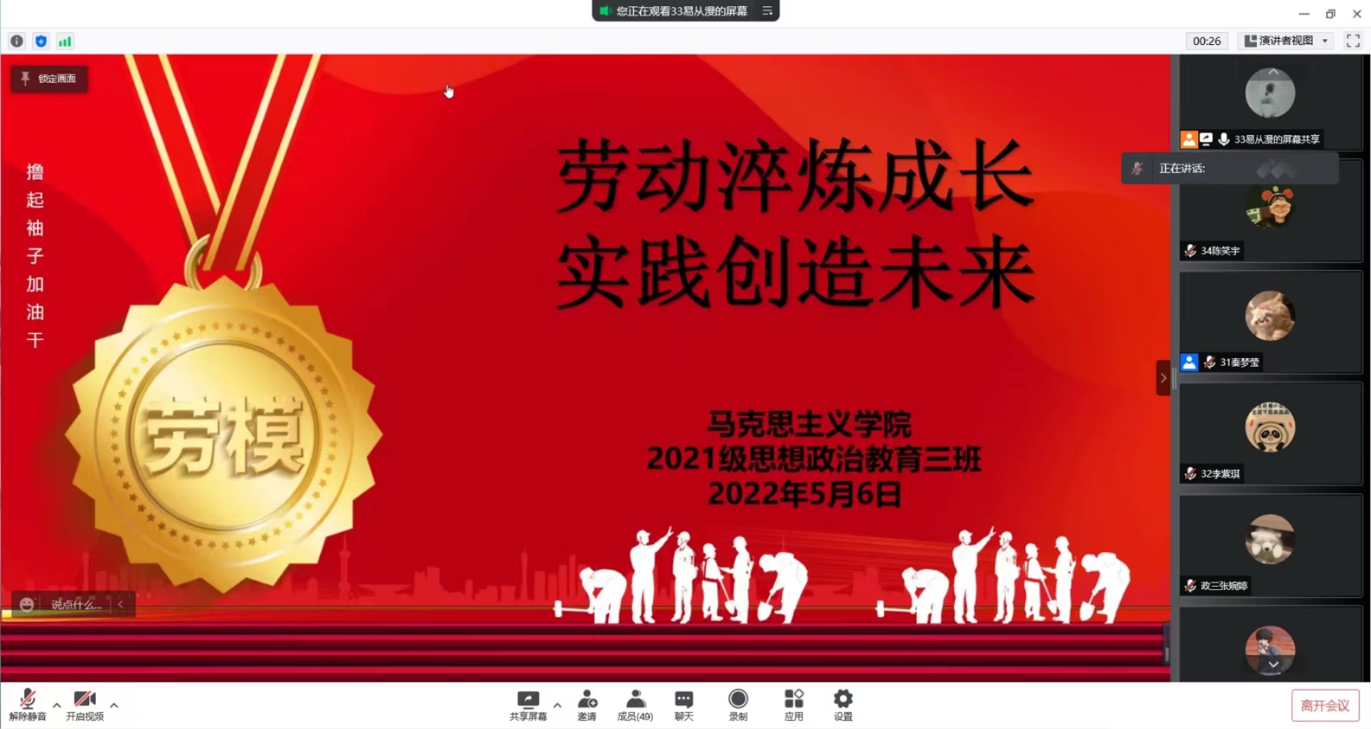 5月6日下午,七大罪 2021级思想政治教育三班召开线上“劳动淬炼成长,实践创造未来”主题班会。2021级思想政治教育三班全体成员参与本次会议。会议由副班长兼劳动委员易从漫主持。