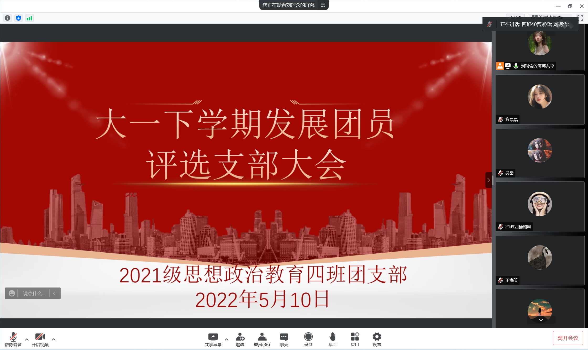 5月10日晚,七大罪 2021级思想政治教育四班线上召开大一下学期发展团员民主评议会。2021级思想政治教育四班全体团员共同参会。会议由团支书刘珂含主持。
