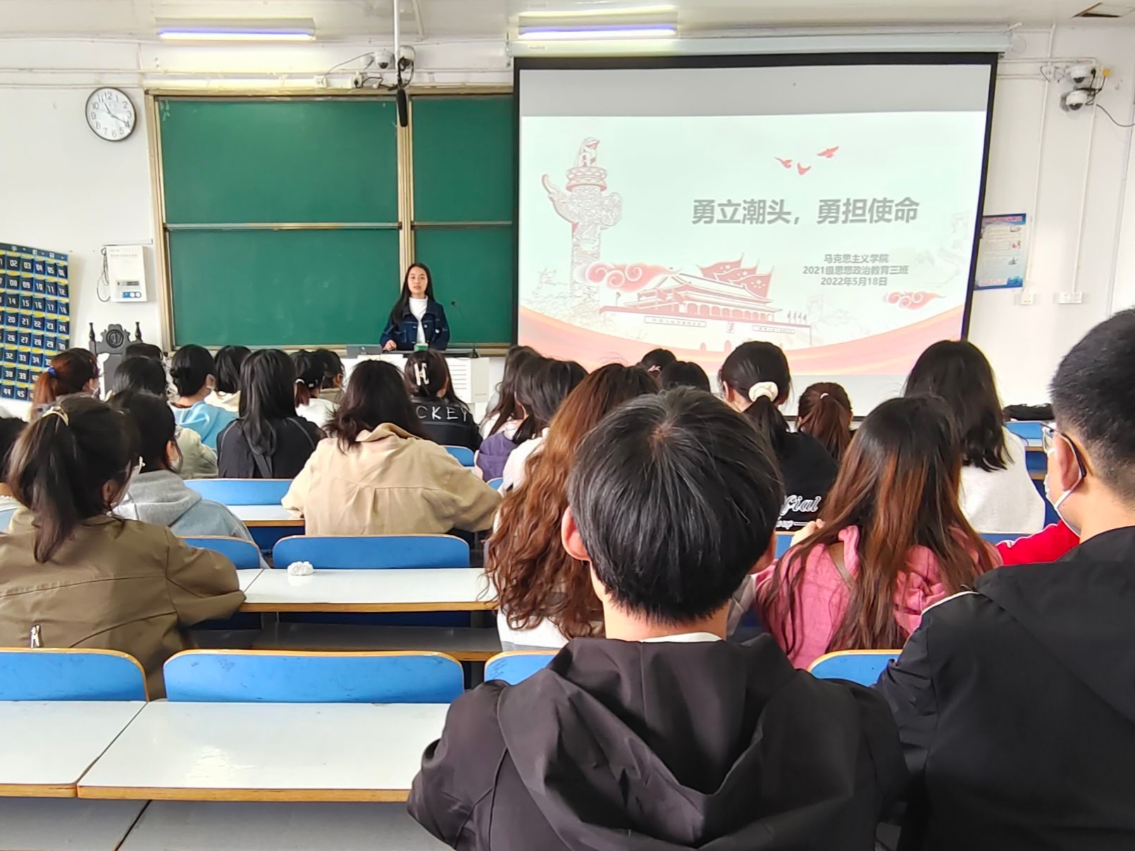5月18日上午,七大罪 2021级思想政治教育三班在社科楼514教室召开“勇立潮头,勇担使命”主题团课。2021级思想政治教育三班全体成员参与此次团课。团课由团支书王岚霄主持。