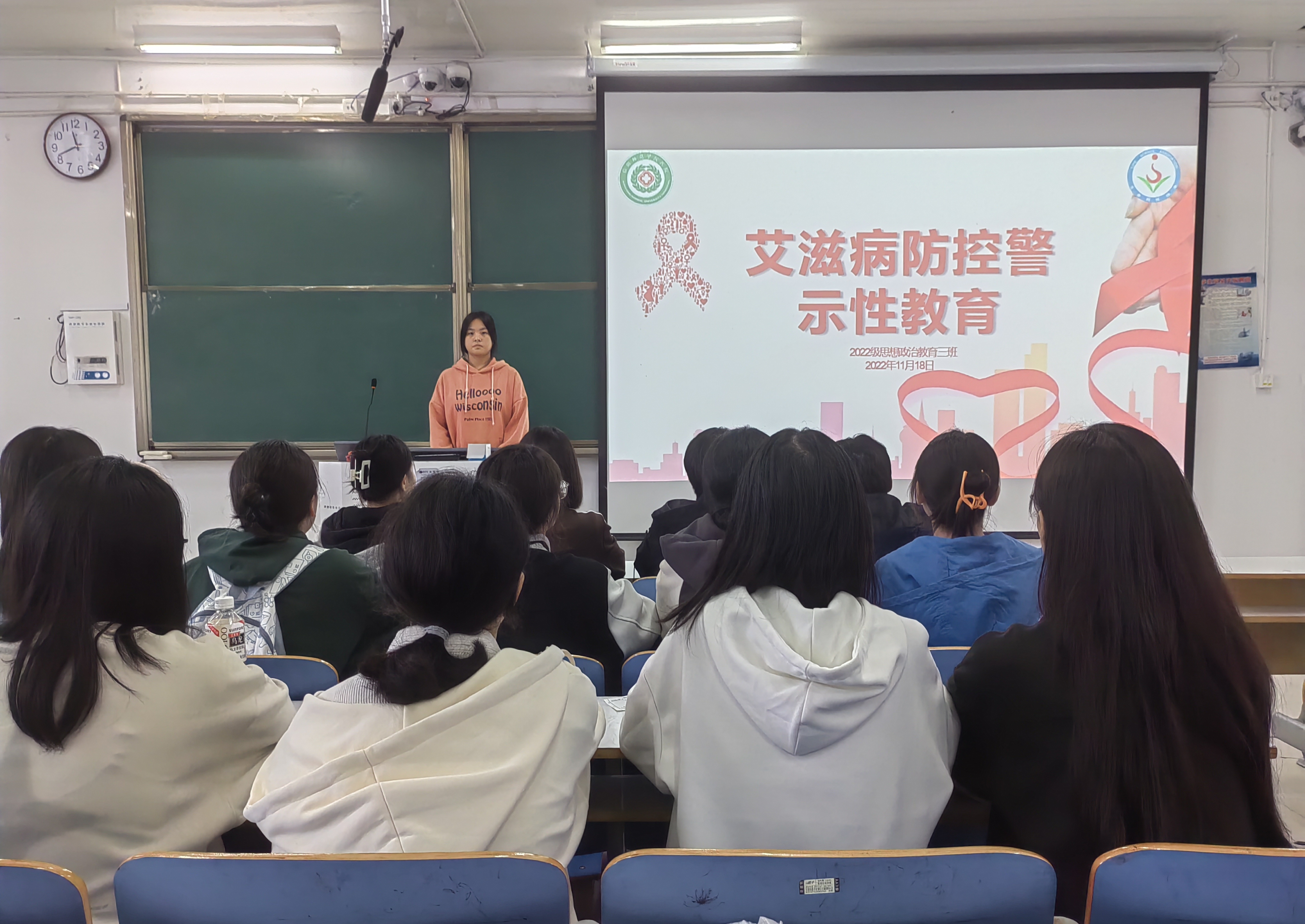 本次班会围绕认识艾滋病、艾滋病传播和预防艾滋病三方面展开。班会伊始,雷露露指出,艾滋病是一种传染性极强的获得性免疫缺陷综合征,同性恋、血友病病人和吸毒者是高危易感人群,同学们要了解和预防传播艾滋病的高危行为,提高防艾意识和保护能力。接着,三位学生代表从血液传播、性传播和母婴传播分别陈述艾滋病的传播手段并告诫同学们要养成良好的生活习惯,形成健康的生活方式是预防的艾滋病的重要保障。随后,雷露露通过艾滋病典型案例强调,大学生要积极学习艾滋病相关知识,坚决拒绝危险行为,做好自身防护。班会最后,余浩洋分发艾滋病知识调查问卷并呼吁大家,扩展艾滋病预防宣传范围,增强艾滋病预防宣传力度,坚决做到不歧视、不辱骂、不诋毁艾滋病人,消除自身误解,关爱艾滋病人。