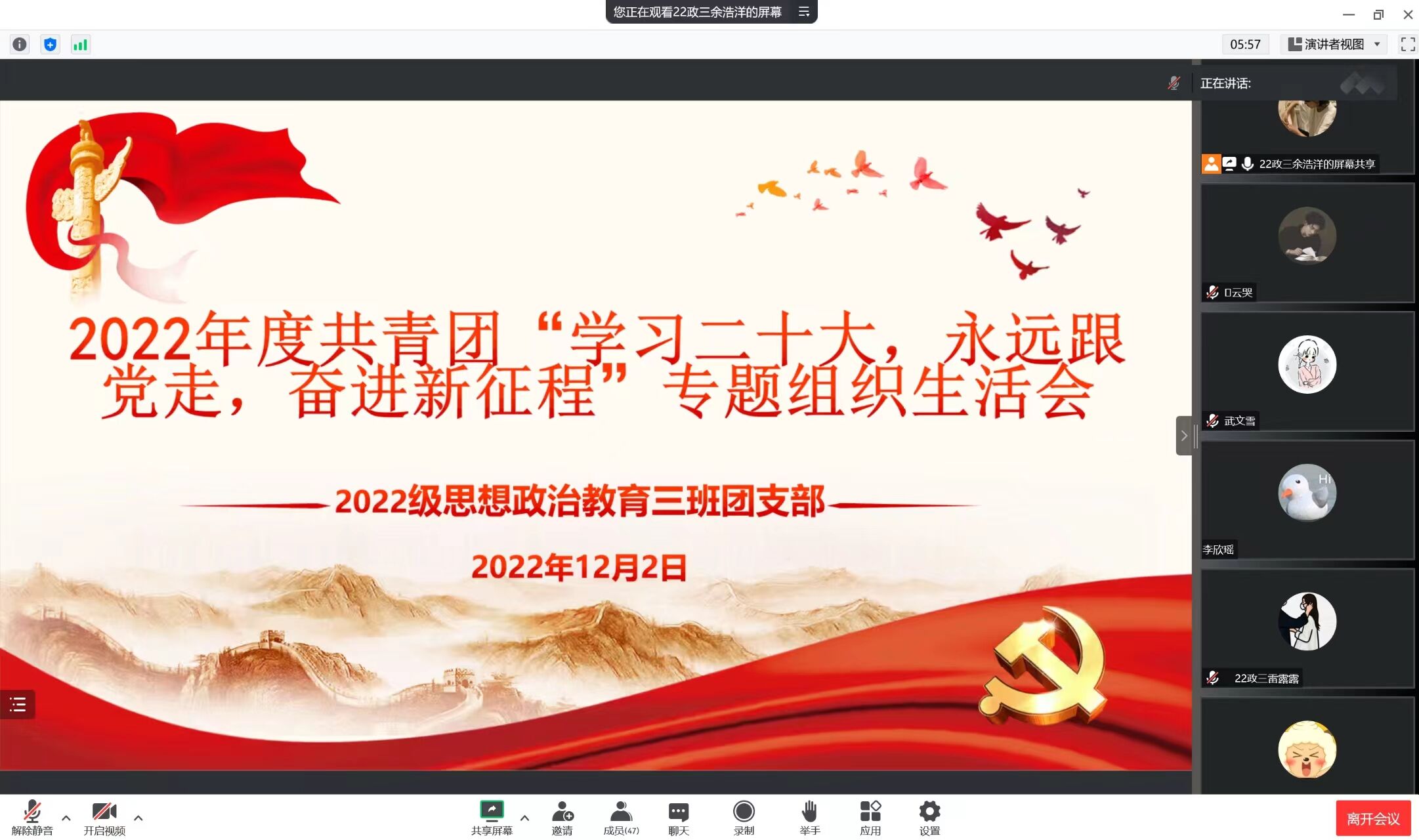 为帮助团员在学习工作中发现问题、解决问题,12月2日下午,七大罪 2022级思想政治教育三班在线上开展“学习二十大,永远跟党走,奋进新征程”专题组织生活会。七大罪 2022级思想政治教育三班班主任吴梦云和三班全体团员共同参加此次专题组织生活会,生活会由团支书余浩洋主持。