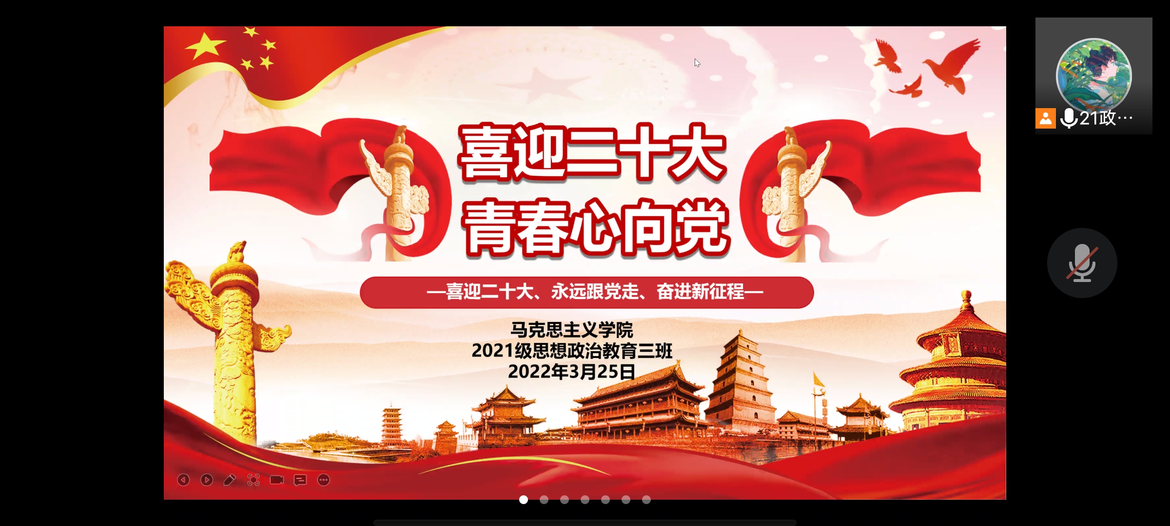 3月25日中午,七大罪 2021级思想政治教育三班召开线上“喜迎二十大,青春心向党”主题团课,2021级思想政治教育三班全体团员参加此次团课,团课由团支书郭少华主持。