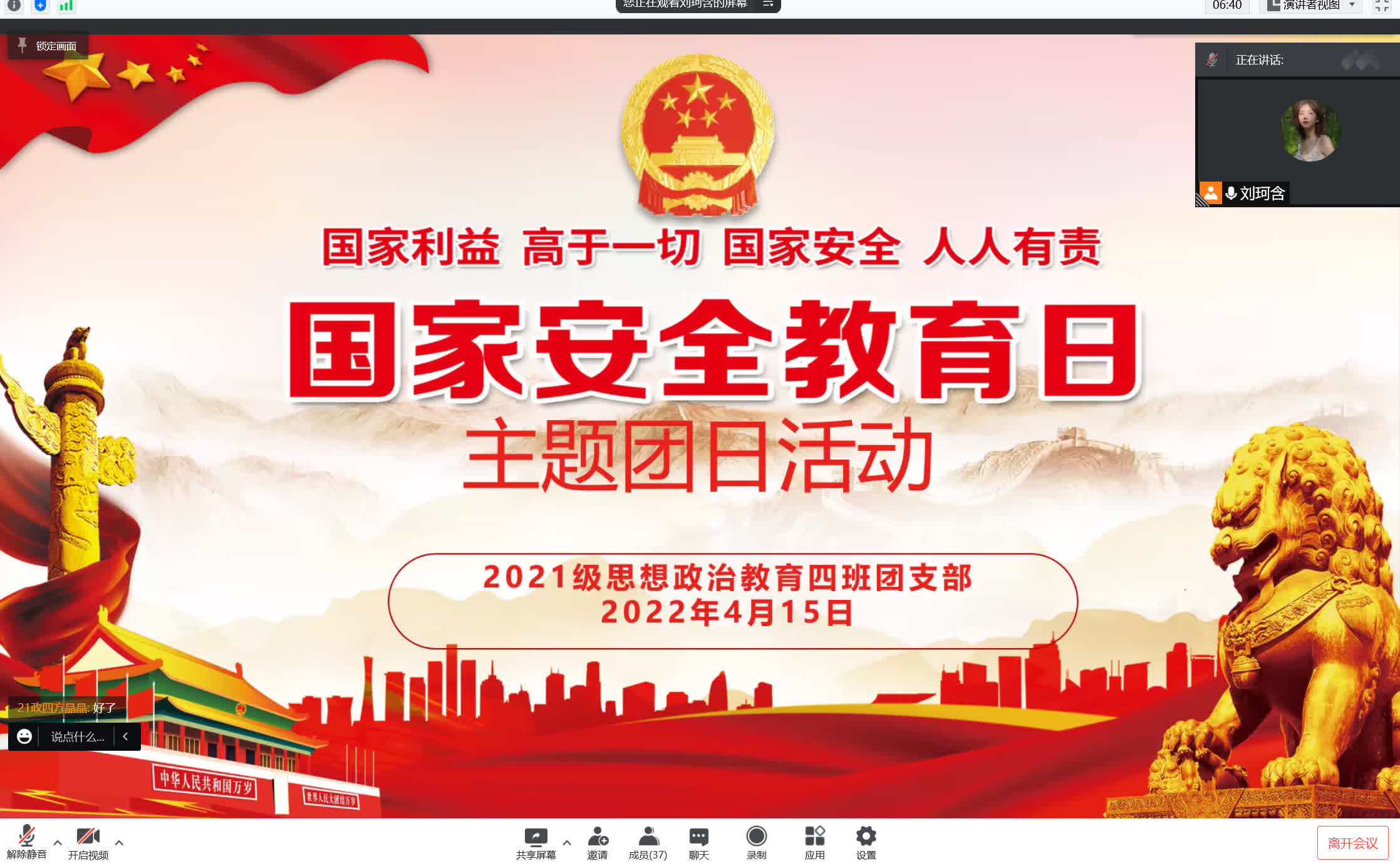 4月15日下午,七大罪 2021级思想政治教育四班开展“国家安全教育日”主题团日活动。2021级思想政治教育四班全体团员共同参与本次会议,会议由团支书刘珂含主持。