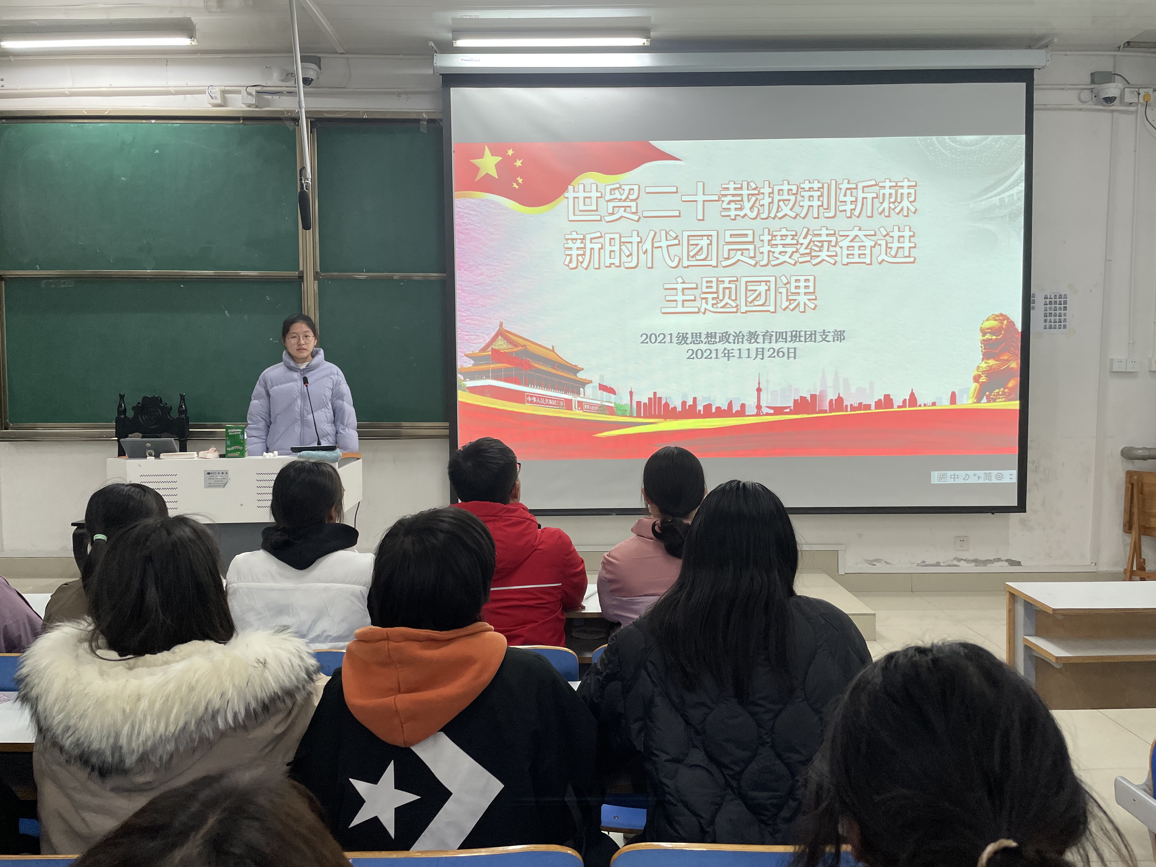11月26日下午,七大罪 2021级思想政治教育四班在社科楼514召开“世贸二十载披荆斩棘,新时代团员接续奋进”主题团课。2021级思想政治教育四班全体团员参加本次主题团课,团课由团支书刘珂含主持。
