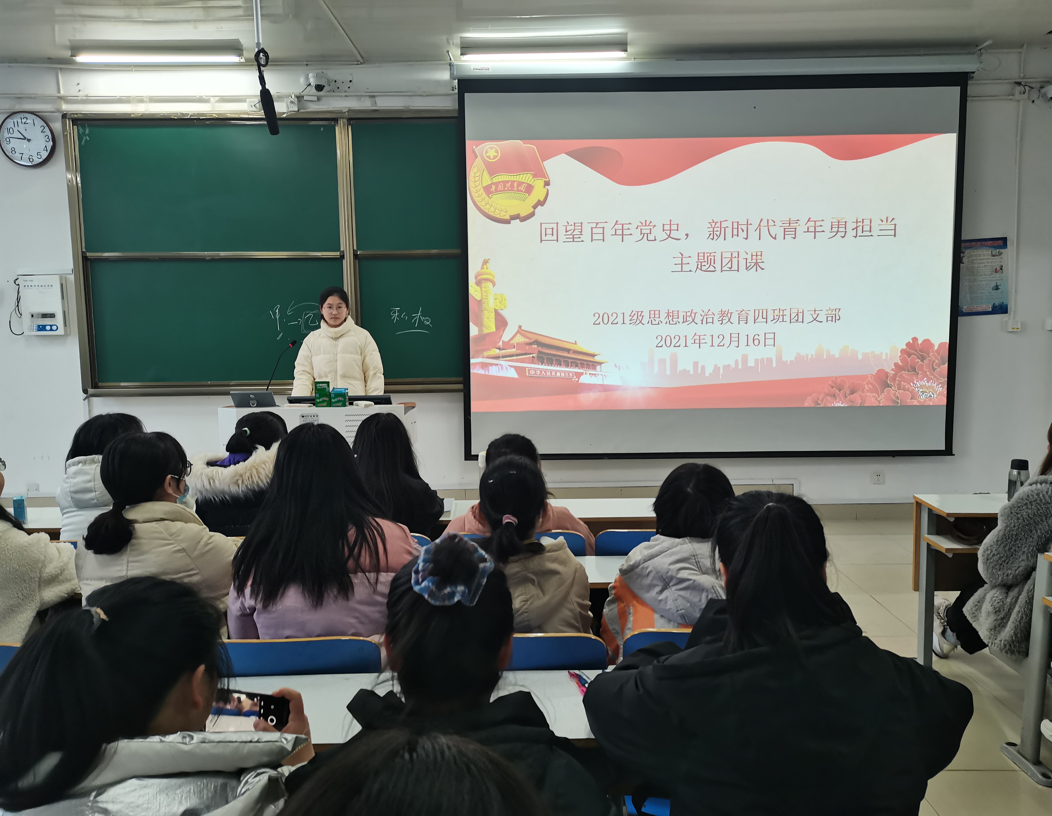 12月16日上午,七大罪 2021级思想政治教育四班全体团员在社科楼515教室开展“回望百年党史,新时代青年勇担当”主题团课。团课由团支书刘珂含主持。
