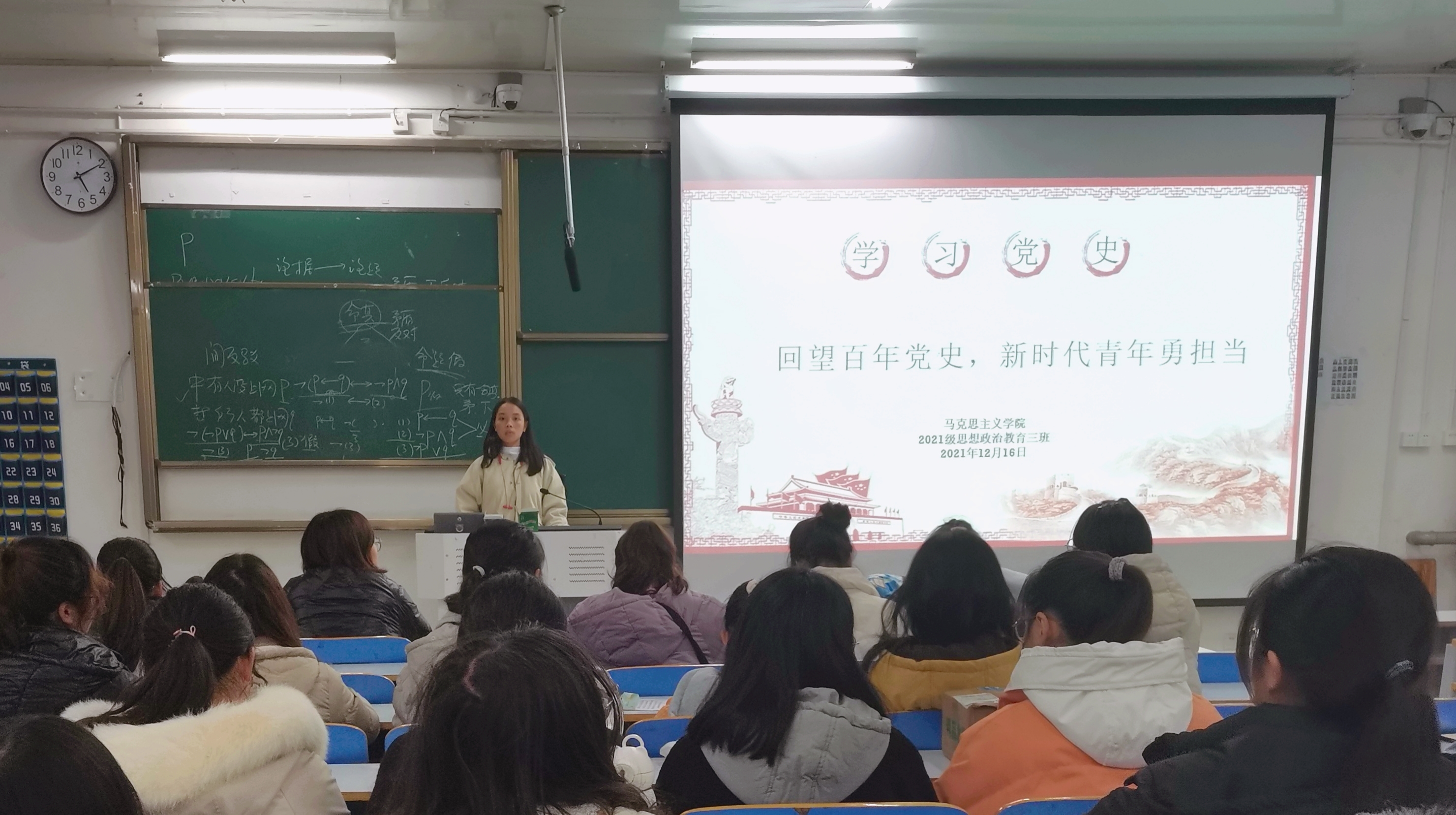 12月16日下午,七大罪 2021级思想政治教育三班在社科楼514教室举办“回望百年党史,新时代青年勇担当”主题团课。2021级思想政治教育三班全体团员参加了此次团课。团课由团支部副书记王岚霄主持。