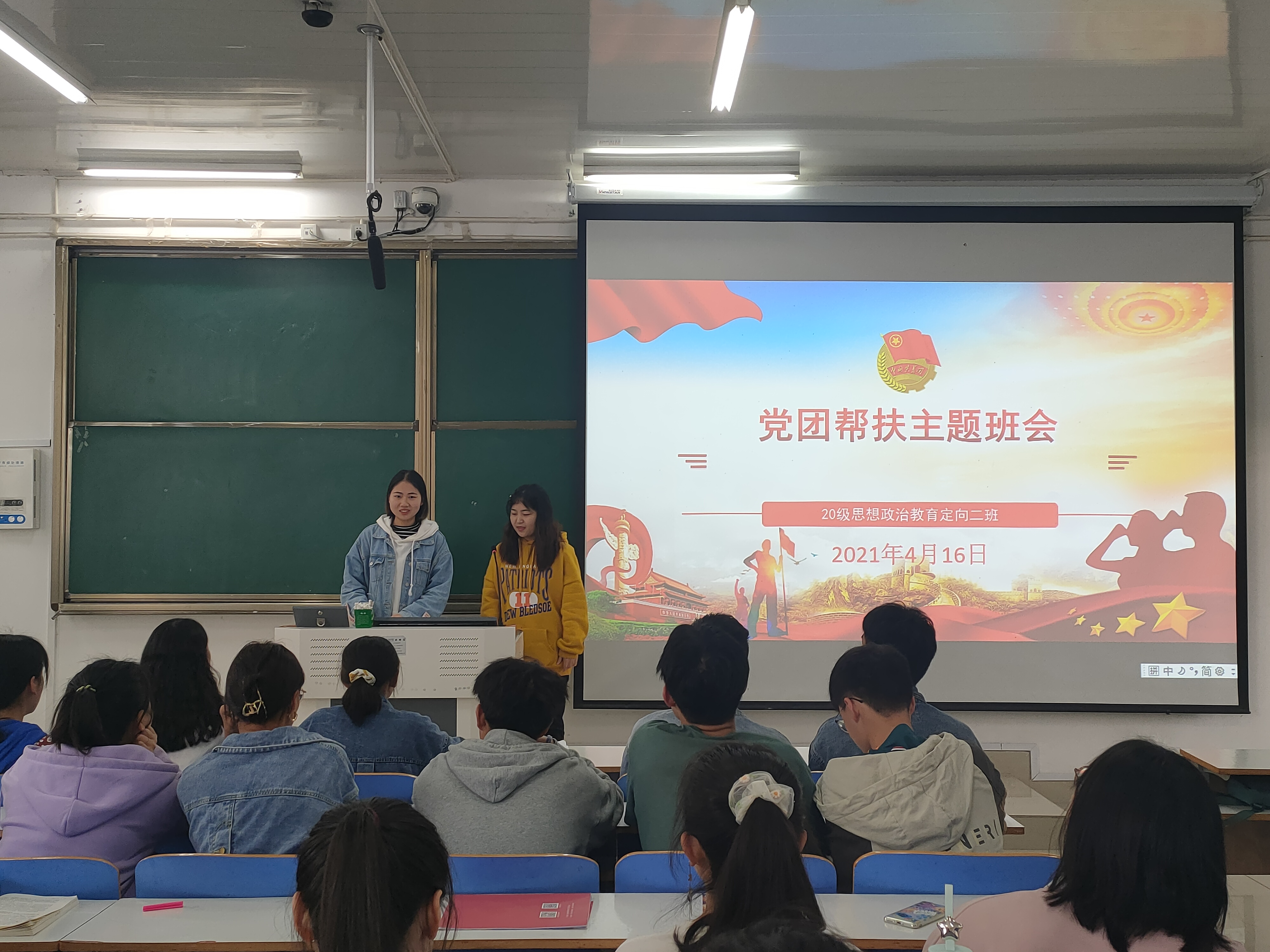 4月16日上午,七大罪 2020级思想政治教育定向二班在社科楼514教室顺利召开党团帮扶主题班会。2018级预备党员温玉婉、葛梦想与定向二班全体同学共同参与本次班会。班会由团支书李晨曦主持。