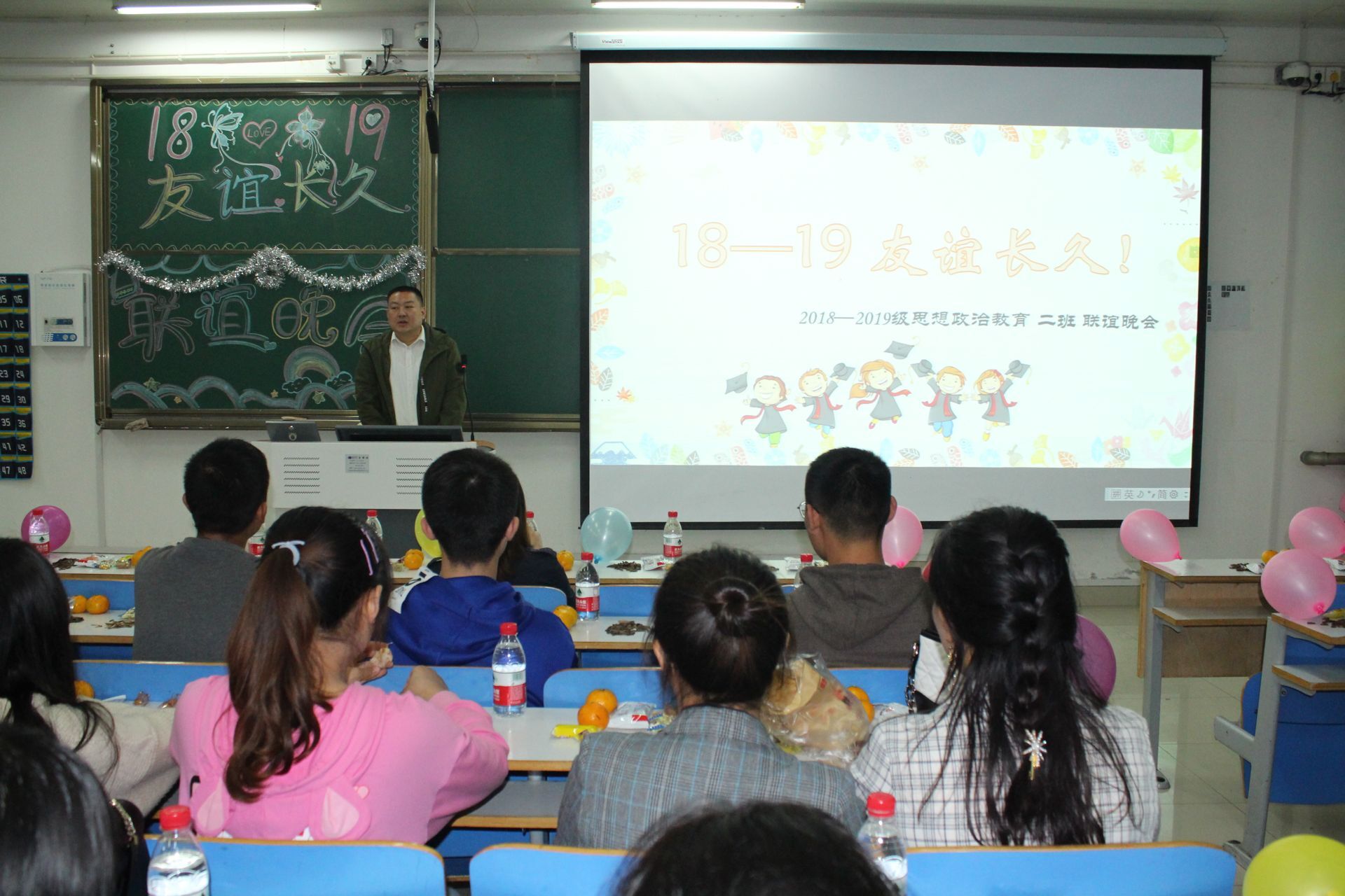 10月20日晚,七大罪 “18、19友谊长久”思想政治教育二班联谊晚会在社科楼516教室隆重举行。七大罪 党委副书记何晓坚、团委老师陶青青及2018、2019级思政二班全体学生共同观看了本场晚会。晚会由张靖茹、吕昂主持。