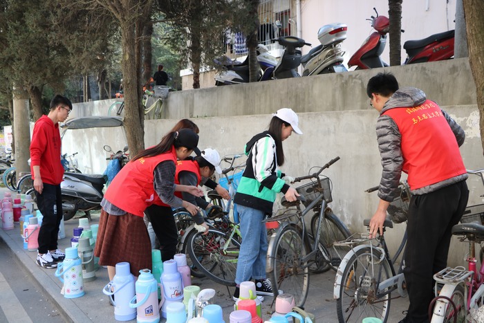 杨康将全体成员分为三组,各组成员在小组长的带领下开始志愿服务活动。第一小组负责前往社科楼、人文楼和海苑路,把倒斜的自行车扶正,摆放整齐,擦拭整洁。第二组成员前往文心亭打扫,将文心亭周围的座椅擦拭干净,给大家提供一个整洁明亮的学习娱乐环境。第三组成员负责图书馆的书籍借阅服务、借阅秩序维持、图书分类排架等工作。整个活动过程中,同学们个个干劲十足,配合默契,无人喊苦,无人叫累,乐在其中。活动结束后,同学们纷纷表示,日后将会继续自觉参与到各类志愿服务活动中去。
